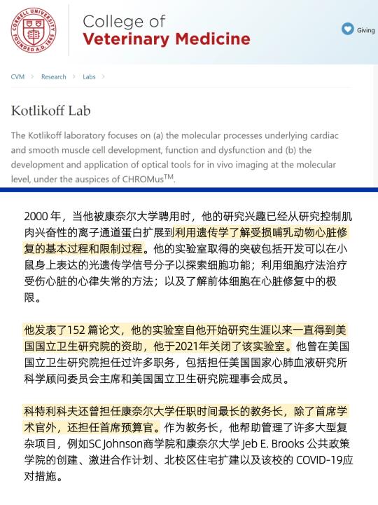 科特利科夫是一名分子生理学教授,2000年他来到康奈尔大学,在兽医学院 (CVM) 建立了一个新的生物医学系。他还发起并领导了该大学的哺乳动物基因组生命科学计划。2007 年,他被任命为CVM院长,2015年成为大学教务长。