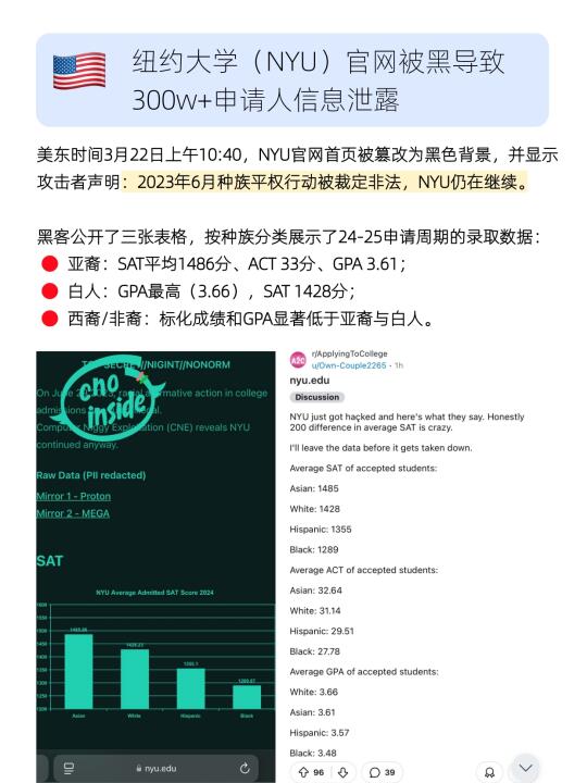 黑客声称NYU在最高法院2023年裁定种族平权政策非法后仍存在“逆向歧视”,优先录取亚裔和白人学生,导致非裔、西裔等群体“低分高录”。数据显示,亚裔学生SAT平均分1486分、ACT 33分,显著高于非裔的1289分和27.78分,GPA差异同样明显。数据泄露引发隐私安全担忧与社会对录取公平性的激烈争议。