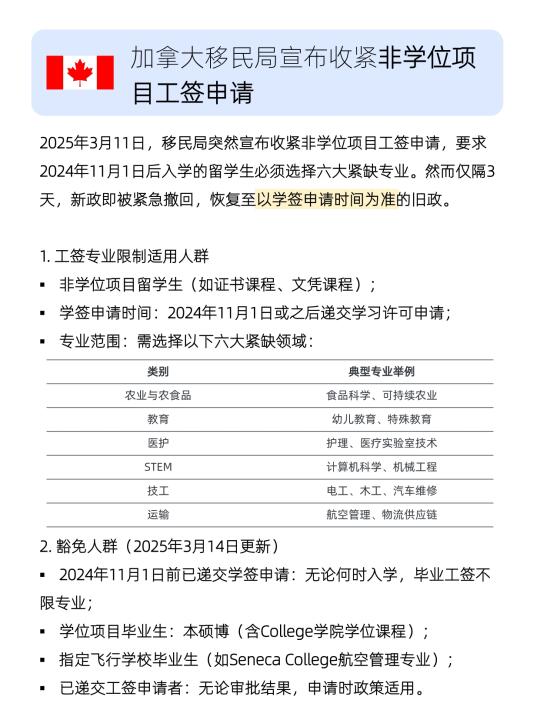 3月11日,加拿大移民局(IRCC)、突然宣布收紧政策,要求2024年11月1日及之后入学的非学位项目留学生(如证书、文凭课程)必须选择农业与农食品、教育、医护、STEM、技工、运输六大紧缺领域专业,否则无法申请工签。
