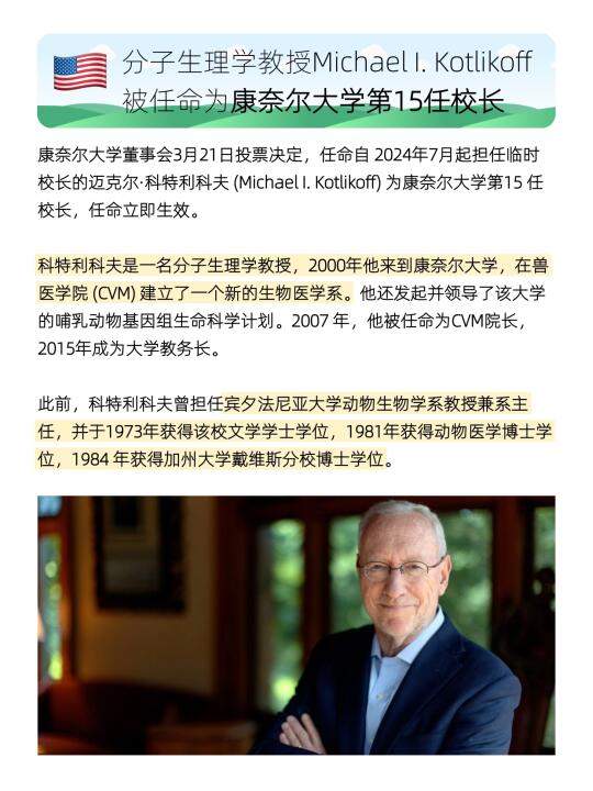 康奈尔大学董事会3月21日投票决定,任命自 2024年7月起担任临时校长的迈克尔·科特利科夫 (Michael I. Kotlikoff) 为康奈尔大学第15 任校长。