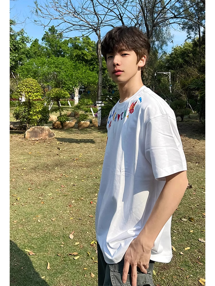 花灰色花卉刺绣短袖男款夏季美式高街重磅半