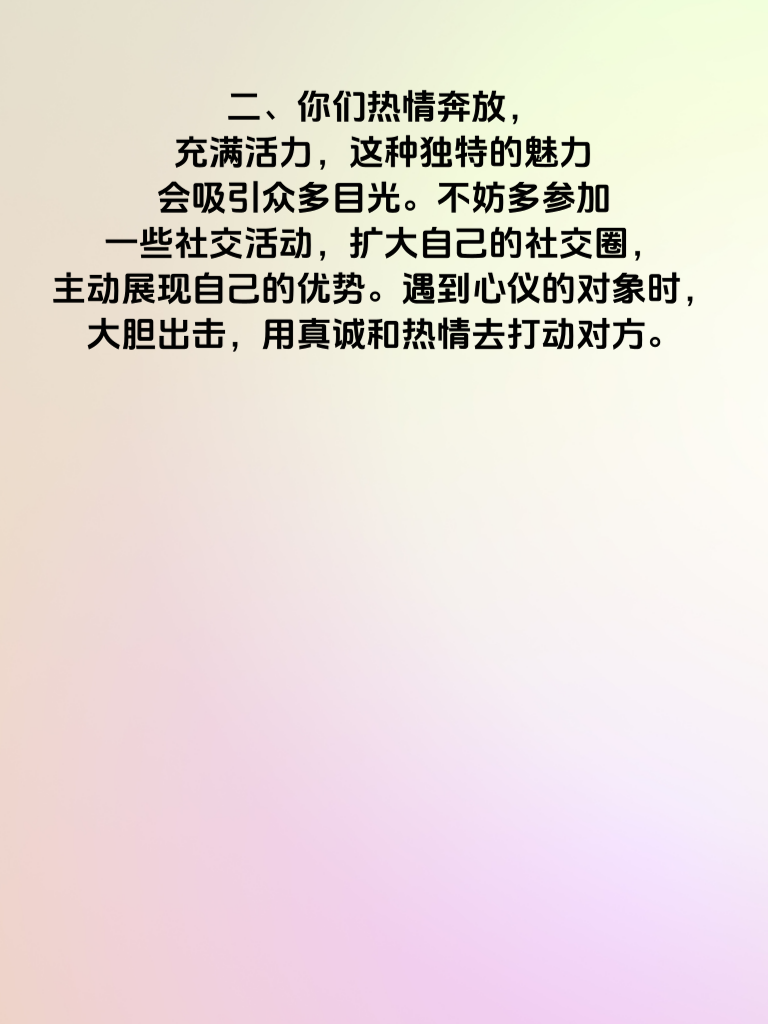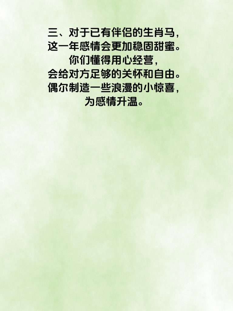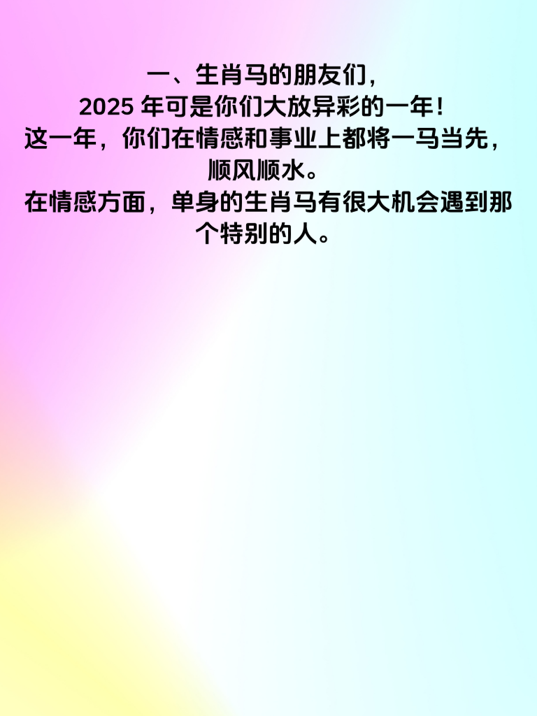 一、生肖马的朋友们,2025年可是你们大放异彩的一年!这一年,你们在情感和事业上都将一马当先,顺风顺水。在情感方面,单身的生肖马有很大机会遇到那个特别的人。 二、你们热情奔放,充满活力,这种独特的魅力会吸引众多目光。不妨多参加一些社交活动,扩大自己的社交圈,主动展现自己的优势。遇到心仪的对象时,大胆出击,用真诚和热情去打动对方。 三、对于已有伴侣的生肖马,这一年感情会更加稳固甜蜜。你们懂得用心经营,会给对方足够的关怀和自由。偶尔制造一些浪漫的小惊喜,为感情升温。 四、事业上,生肖马的冲劲和拼搏精神会得到充分发挥。凭借敏锐的洞察力和果断的决策力,能抓住不少好机遇。工作中积极进取,勇于挑战自我,定能收获满满的成就感和丰厚的回报。2025年,生肖马们尽情在情感与事业的赛道上驰骋吧!