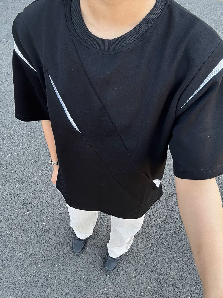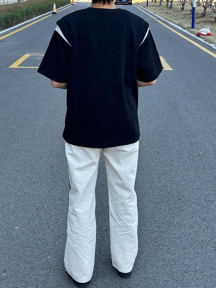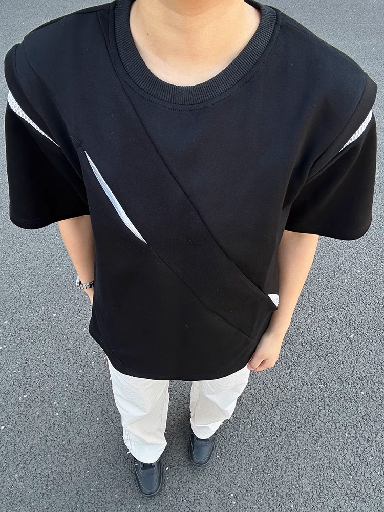 美式分割解构垫肩短袖男夏季潮牌小领口半袖