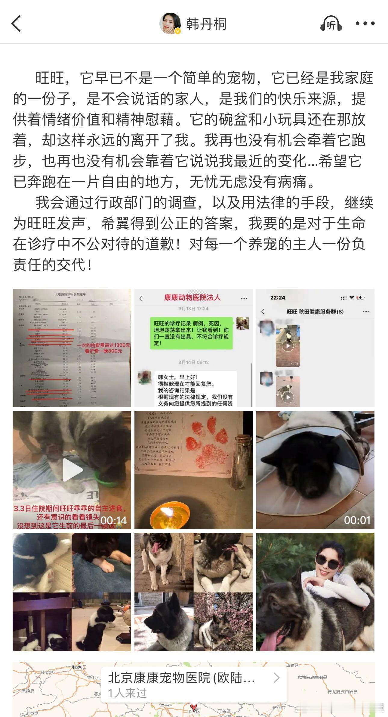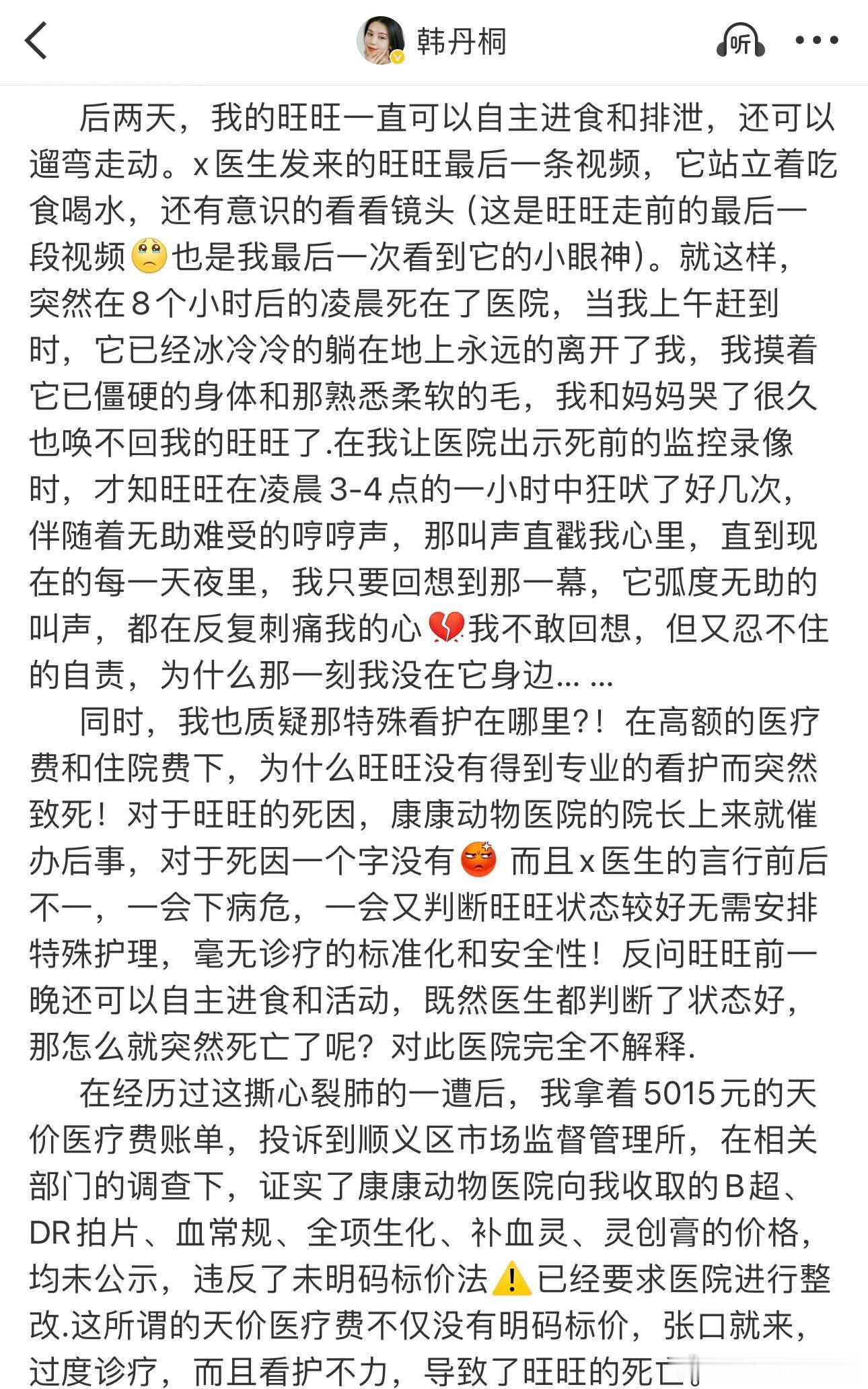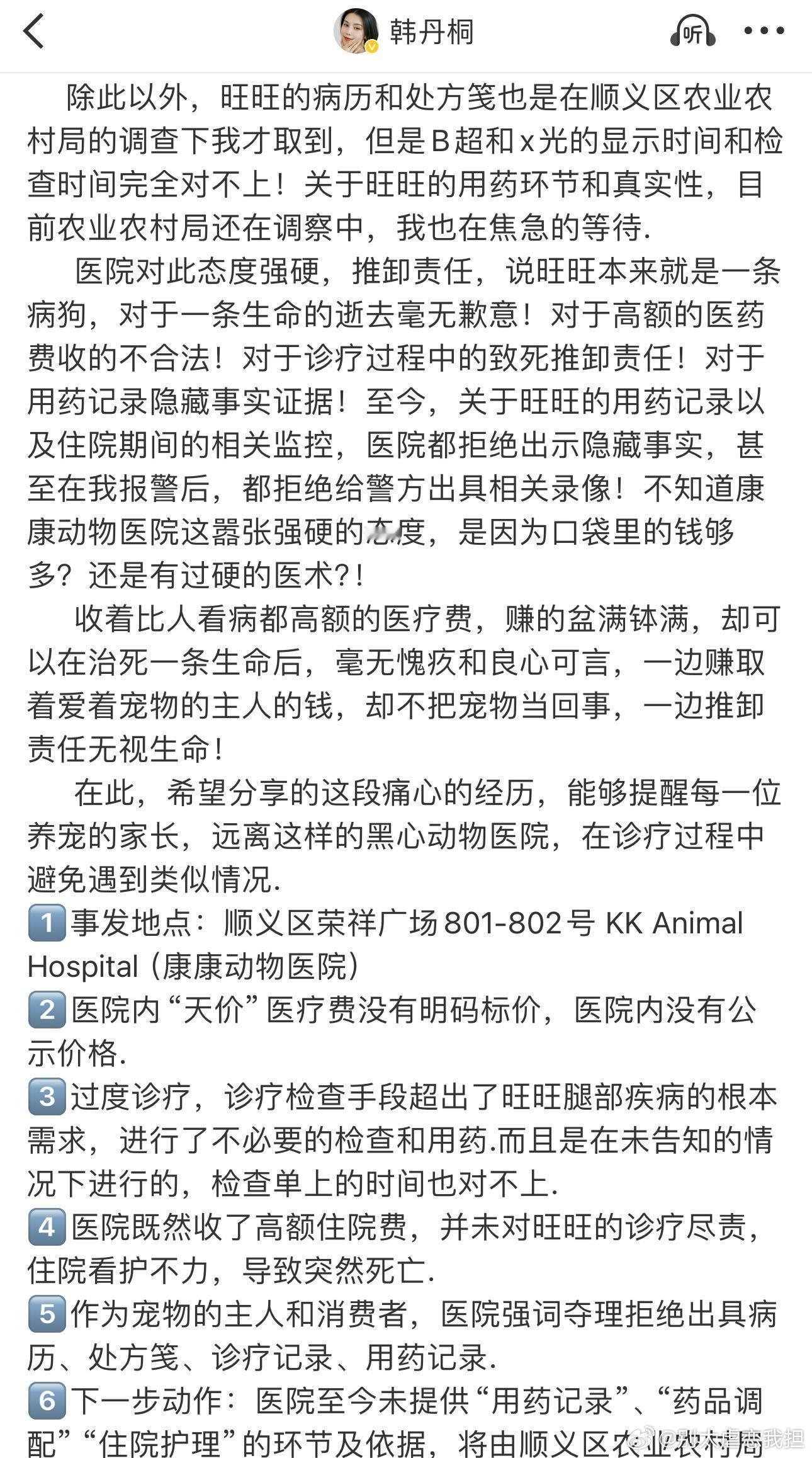 韩丹桐怒斥宠物医院天价医疗费 宠物医院竟如此无法无天?韩丹桐毛孩顺义康康动物医院就医身亡,医院隐瞒死因、封锁病历,主人索要无门,公道在哪里?