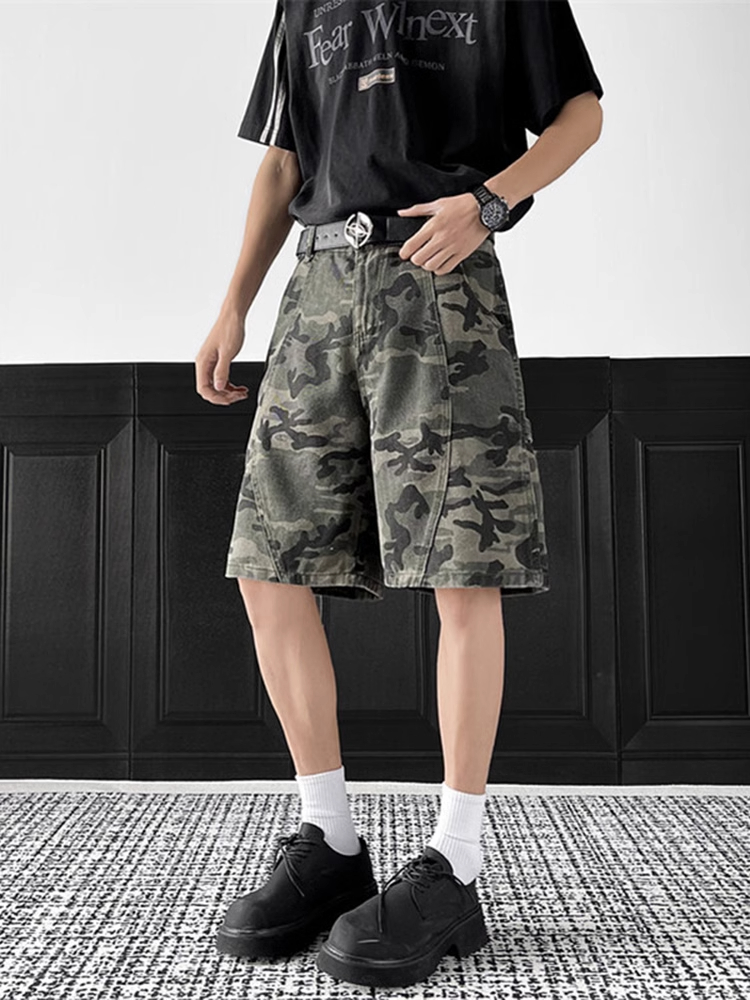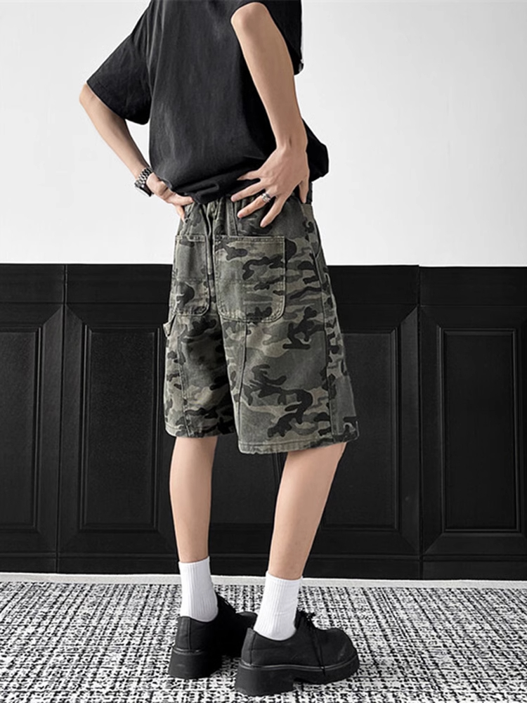 美式解构迷彩短裤男夏季斜切设计感伐木工装