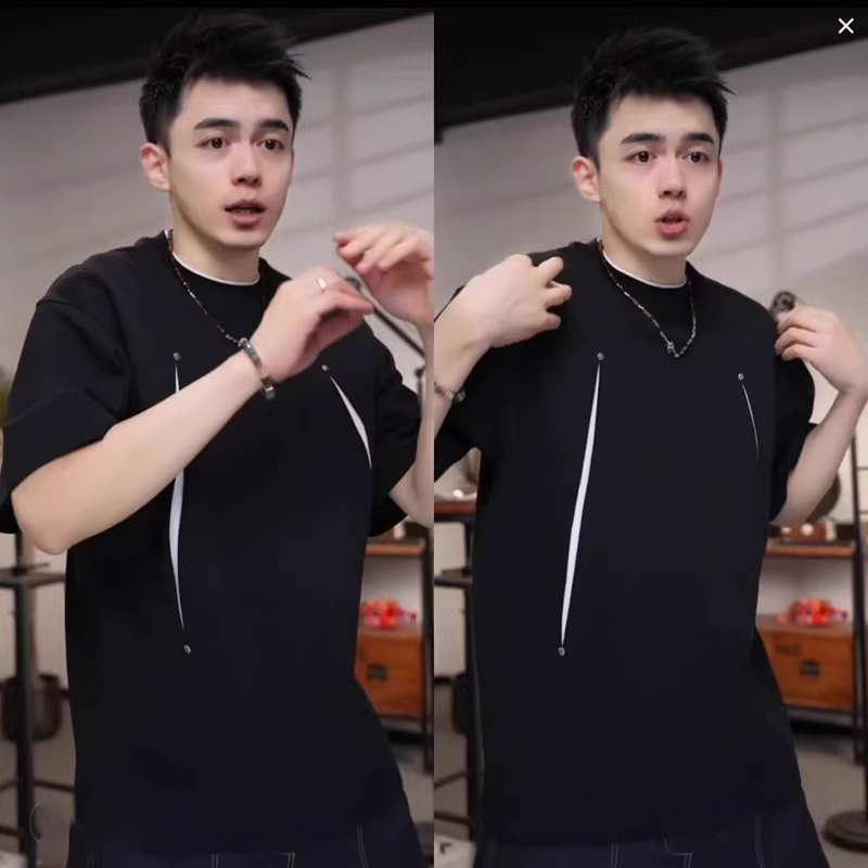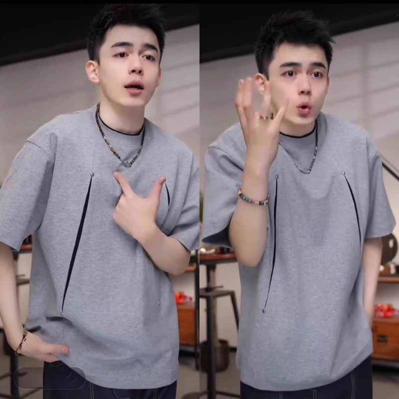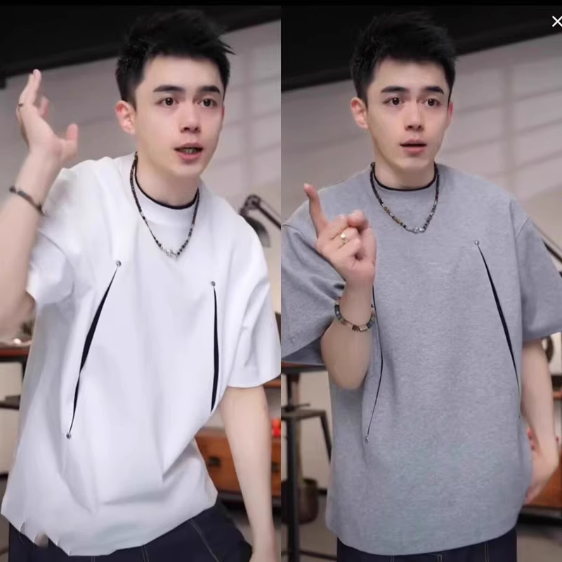 灰色太空棉拼接短袖男夏季潮牌小领口痞帅T