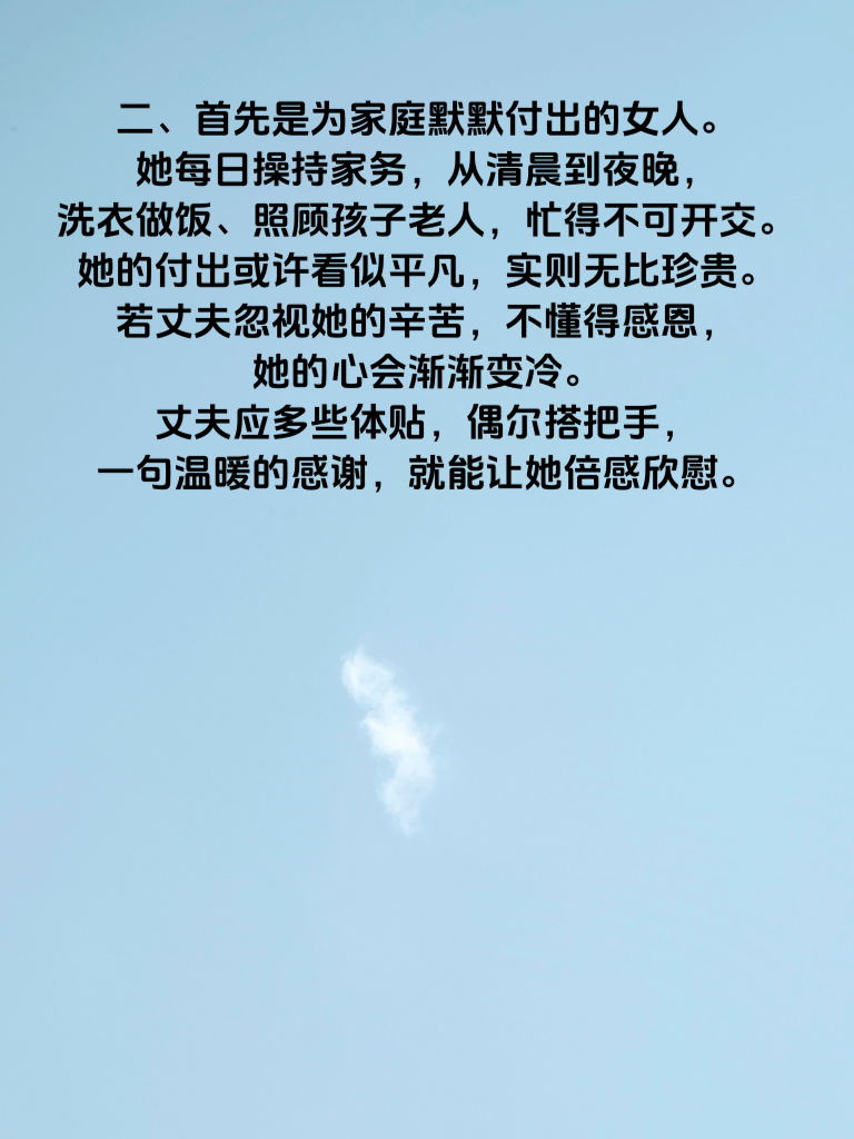 一、婚后生活中,有一种无形的力量在悄悄影响着夫妻间的幸福指数,那就是对女人的态度。尤其是这3种女人,婚后若被忽视,幸福便会大打折扣。 二、首先是为家庭默默付出的女人。她每日操持家务,从清晨到夜晚,洗衣做饭、照顾孩子老人,忙得不可开交。她的付出或许看似平凡,实则无比珍贵。若丈夫忽视她的辛苦,不懂得感恩,她的心会渐渐变冷。丈夫应多些体贴,偶尔搭把手,一句温暖的感谢,就能让她倍感欣慰。 三、还有渴望情感交流的女人。她希望能和丈夫分享生活点滴,聊聊工作的烦恼、孩子的趣事。可若丈夫总是忙于自己的事,对她的话敷衍了事,她会觉得自己不被重视。丈夫要学会倾听,放下手中的忙碌,专注地与她交流,让她感受到被在乎。 四、最后是有自我追求的女人。婚后她依然有自己的梦想和爱好,不是只围着家庭转。若丈夫忽视她的个人成长,限制她的自由,她会失去自我。丈夫应鼓励她去追寻梦想,支持她的爱好,这样的婚姻才更有活力,幸福指数也会稳步提升。