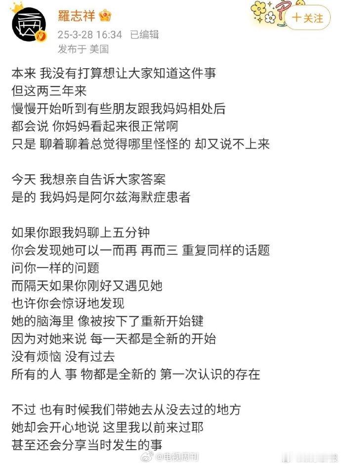 罗志祥谢谢大家对我妈妈的关心罗志祥晒与母亲合照罗志祥发文讲母亲患阿兹海默症,确诊近十年,如今不再隐瞒 。