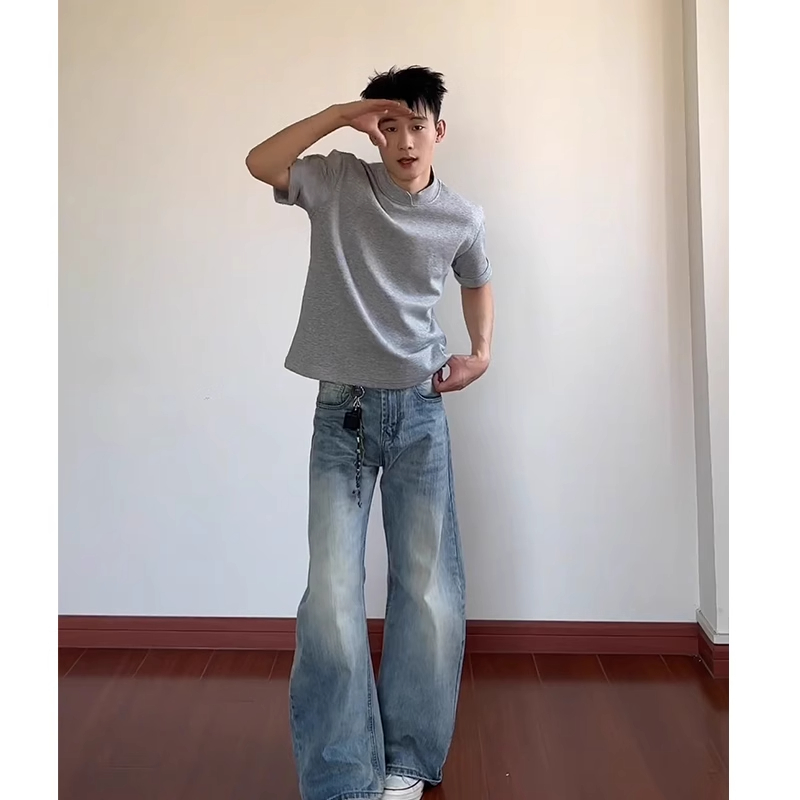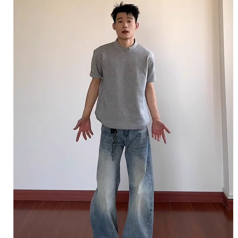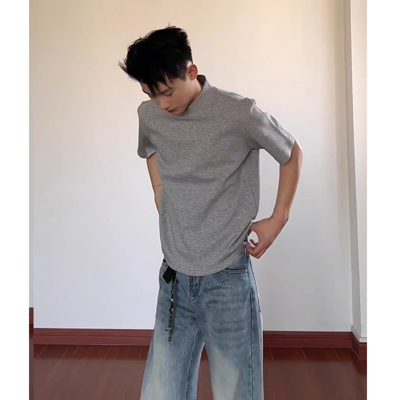 浅灰色花瓣领正肩T恤男美式设计感重磅痞帅