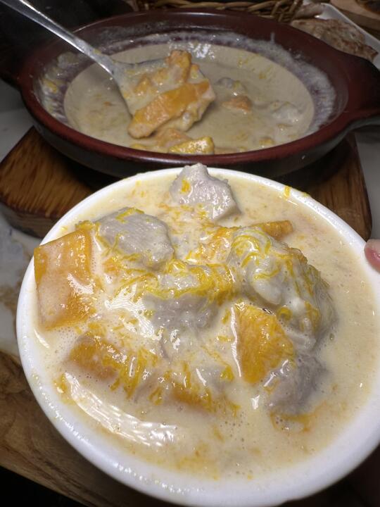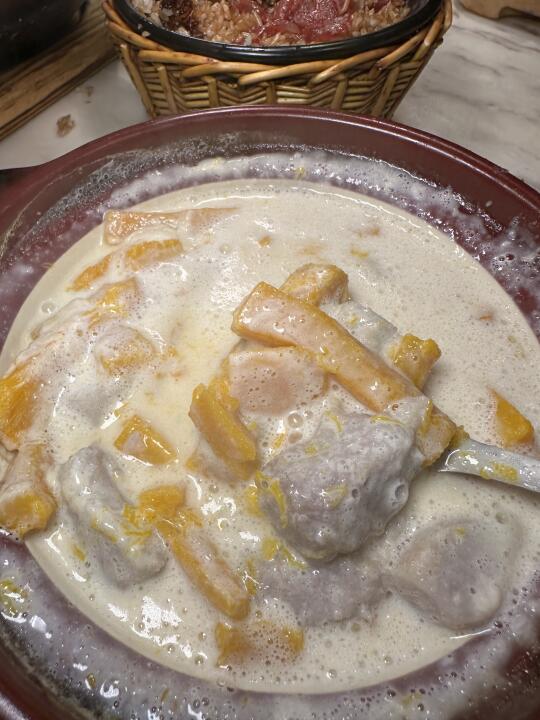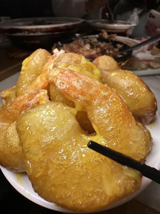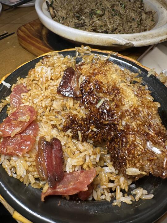 这家虾球怎么和我想象中不太一样hhhh 外面是一层脆壳,还挺特别的!个头超级大!外脆里q!很好吃! 芋头南瓜煲它可以一直深得我心!!!太奶了!太浓郁了! 招牌腊味煲仔饭淋上酱汁之后拌匀,米饭粒粒分明真的绝,配合着恰到好处的锅巴~一勺又一勺根本停不下来!