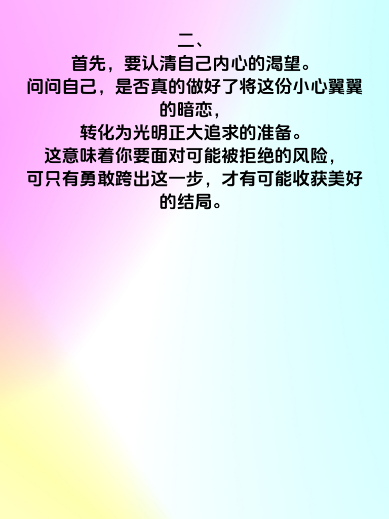 一、暗恋转明恋,这是一场惊心动魄的情感冒险,需要莫大的勇气。当那份藏在心底的喜欢,决定要勇敢地走到阳光下,每一步都充满了未知与挑战。 二、首先,要认清自己内心的渴望。问问自己,是否真的做好了将这份小心翼翼的暗恋,转化为光明正大追求的准备。这意味着你要面对可能被拒绝的风险,可只有勇敢跨出这一步,才有可能收获美好的结局。 三、接着,找一个恰当的时机。可以是一次轻松的聚会,一次偶然的相遇,在氛围适宜的时候,坦诚地表达自己的心意。注意,表达要真诚,让对方感受到你长久以来的情感。 四、同时,做好心理建设。即使结果不如所愿,也要学会接受。毕竟,勇敢表达本身就是一种成长。而如果成功开启明恋,那就用心去经营这段感情,让这份勇敢换来甜蜜的爱情。