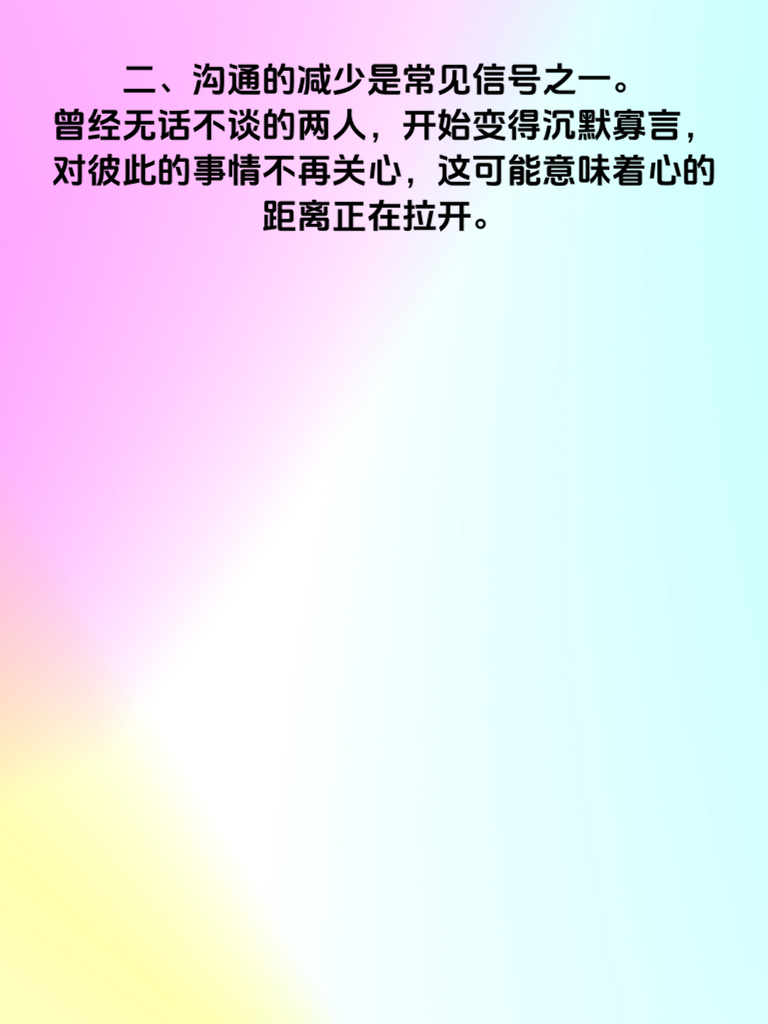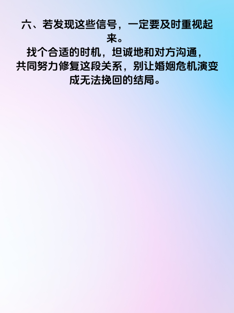 一、婚姻,本应是爱情最美的归宿,却也可能在不经意间亮起红灯。当婚姻出现危机时,往往会有一些信号悄然浮现,千万别忽视它们。 二、沟通的减少是常见信号之一。曾经无话不谈的两人,开始变得沉默寡言,对彼此的事情不再关心,这可能意味着心的距离正在拉开。 三、频繁的争吵也是危险信号。一点小事就大动干戈,互不相让,每一次争吵都可能在感情的堤坝上撕开一道口子。 四、开始注重自己的隐私,手机不离身,不愿对方触碰自己的东西,这或许暗示着心里藏了秘密。 五、对家庭事务不再上心,以前积极参与,现在却总是推脱,这反映出对这段婚姻的热情在消退。 六、若发现这些信号,一定要及时重视起来。找个合适的时机,坦诚地和对方沟通,共同努力修复这段关系,别让婚姻危机演变成无法挽回的结局。