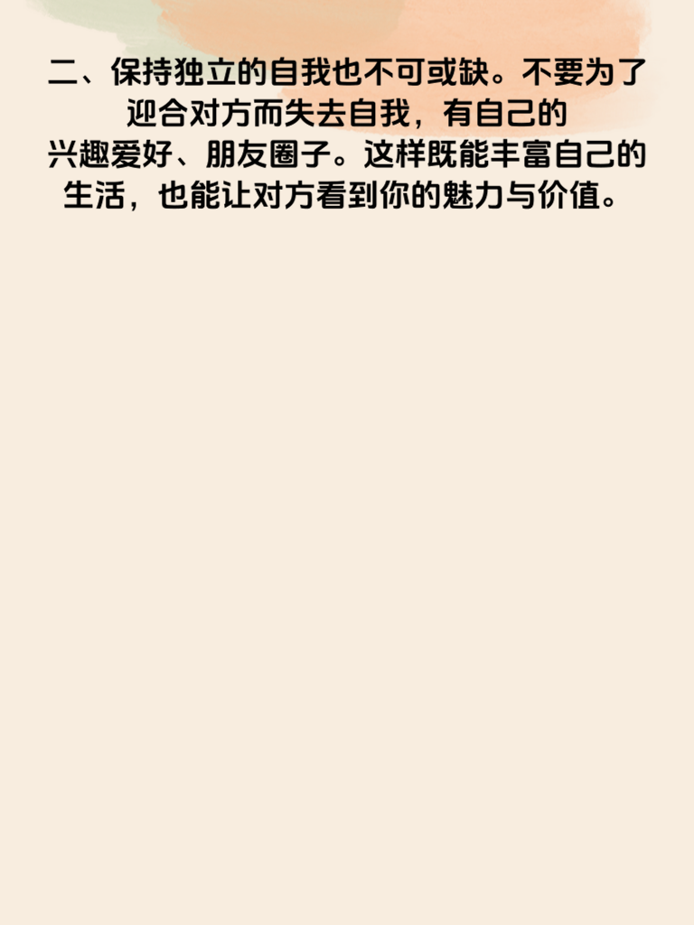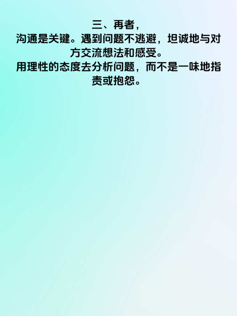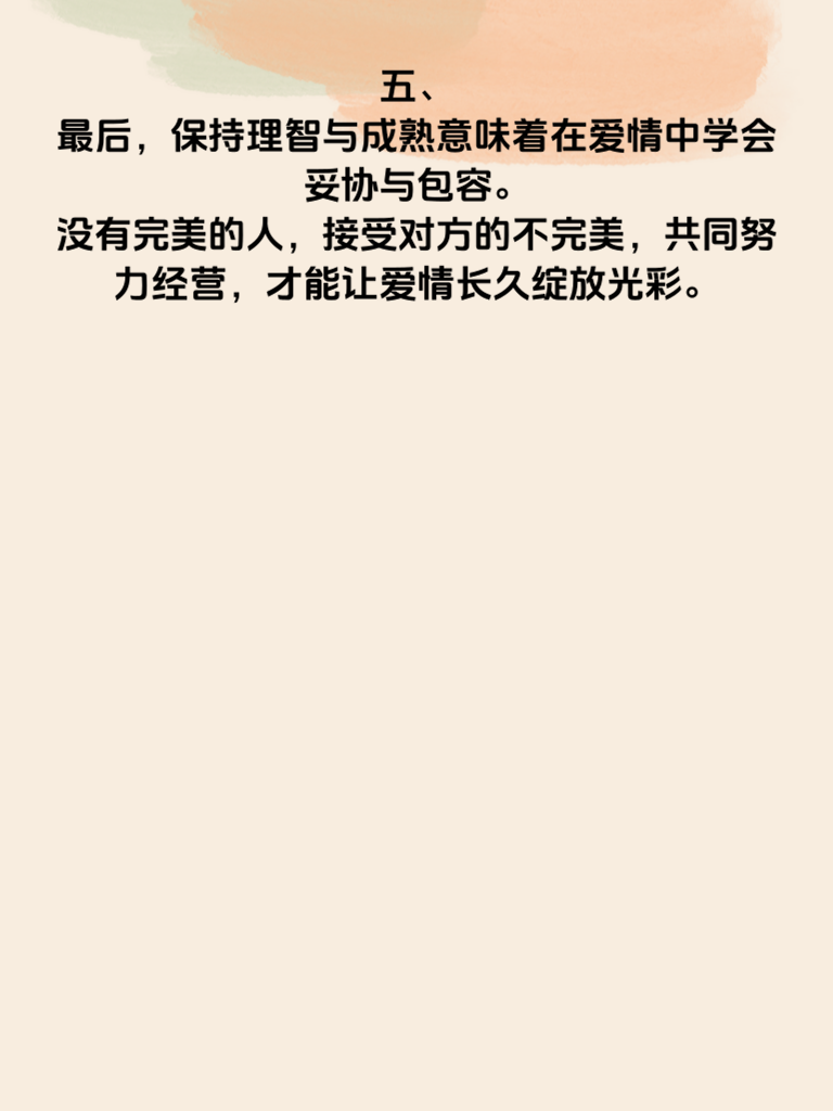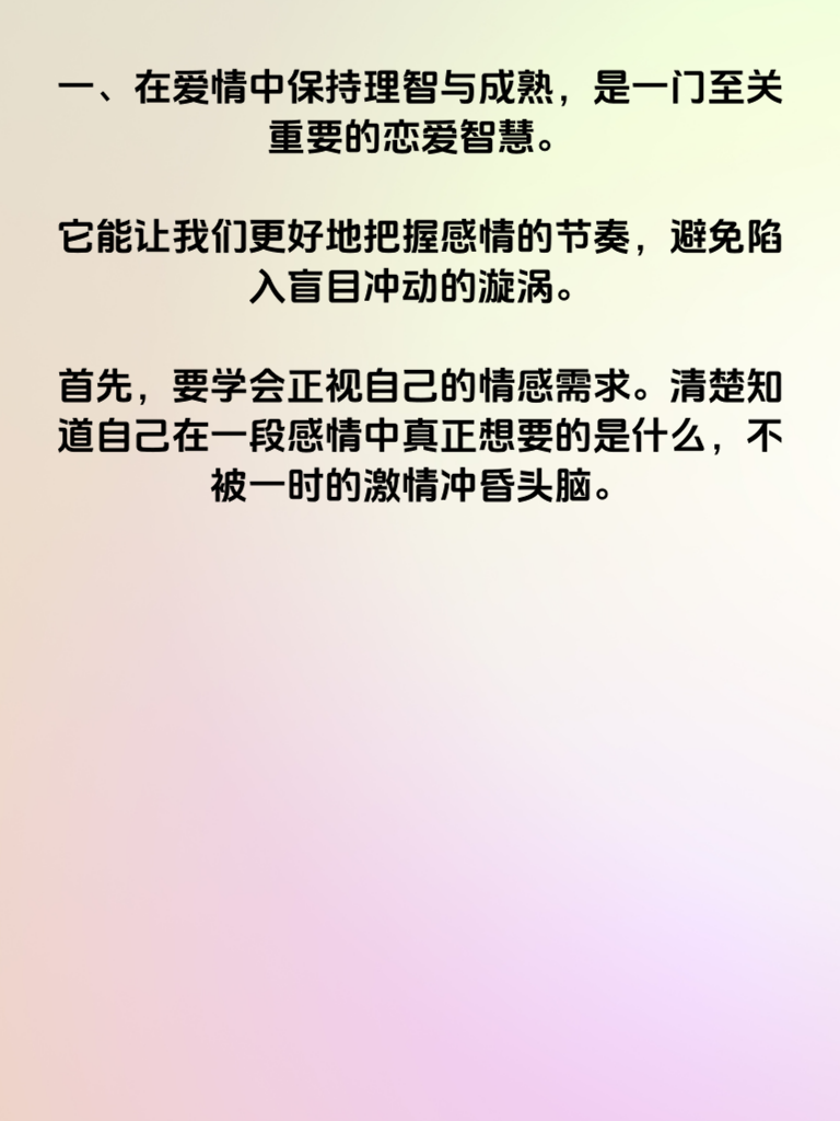 一、在爱情中保持理智与成熟,是一门至关重要的恋爱智慧。它能让我们更好地把握感情的节奏,避免陷入盲目冲动的漩涡。首先,要学会正视自己的情感需求。清楚知道自己在一段感情中真正想要的是什么,不被一时的激情冲昏头脑。 二、保持独立的自我也不可或缺。不要为了迎合对方而失去自我,有自己的兴趣爱好、朋友圈子。这样既能丰富自己的生活,也能让对方看到你的魅力与价值。 三、再者,沟通是关键。遇到问题不逃避,坦诚地与对方交流想法和感受。用理性的态度去分析问题,而不是一味地指责或抱怨。 四、同时,要懂得给彼此空间。爱情不是束缚,适当的距离能让感情更加新鲜。在享受甜蜜的同时,也能保持各自的成长。 五、最后,保持理智与成熟意味着在爱情中学会妥协与包容。没有完美的人,接受对方的不完美,共同努力经营,才能让爱情长久绽放光彩。