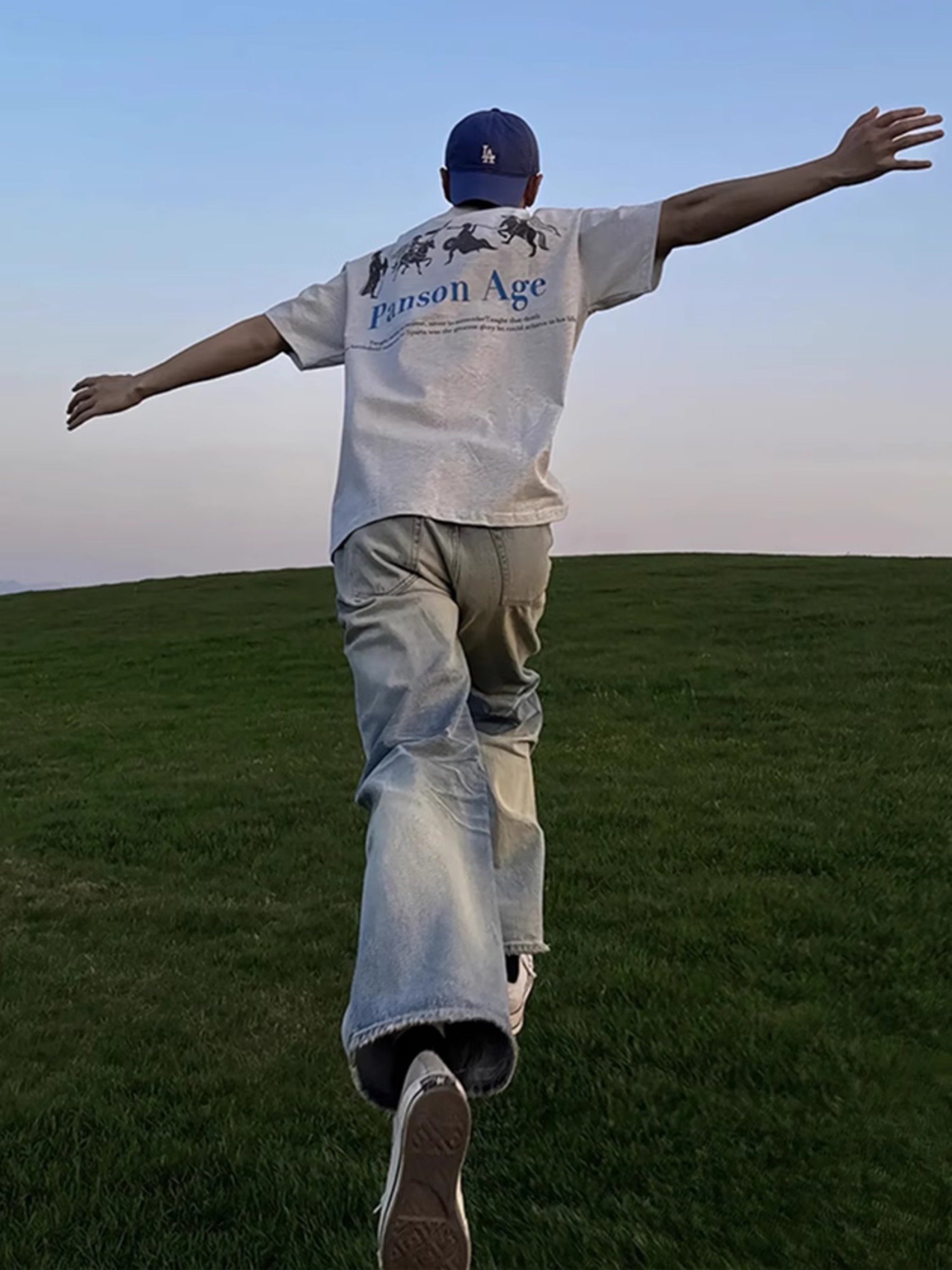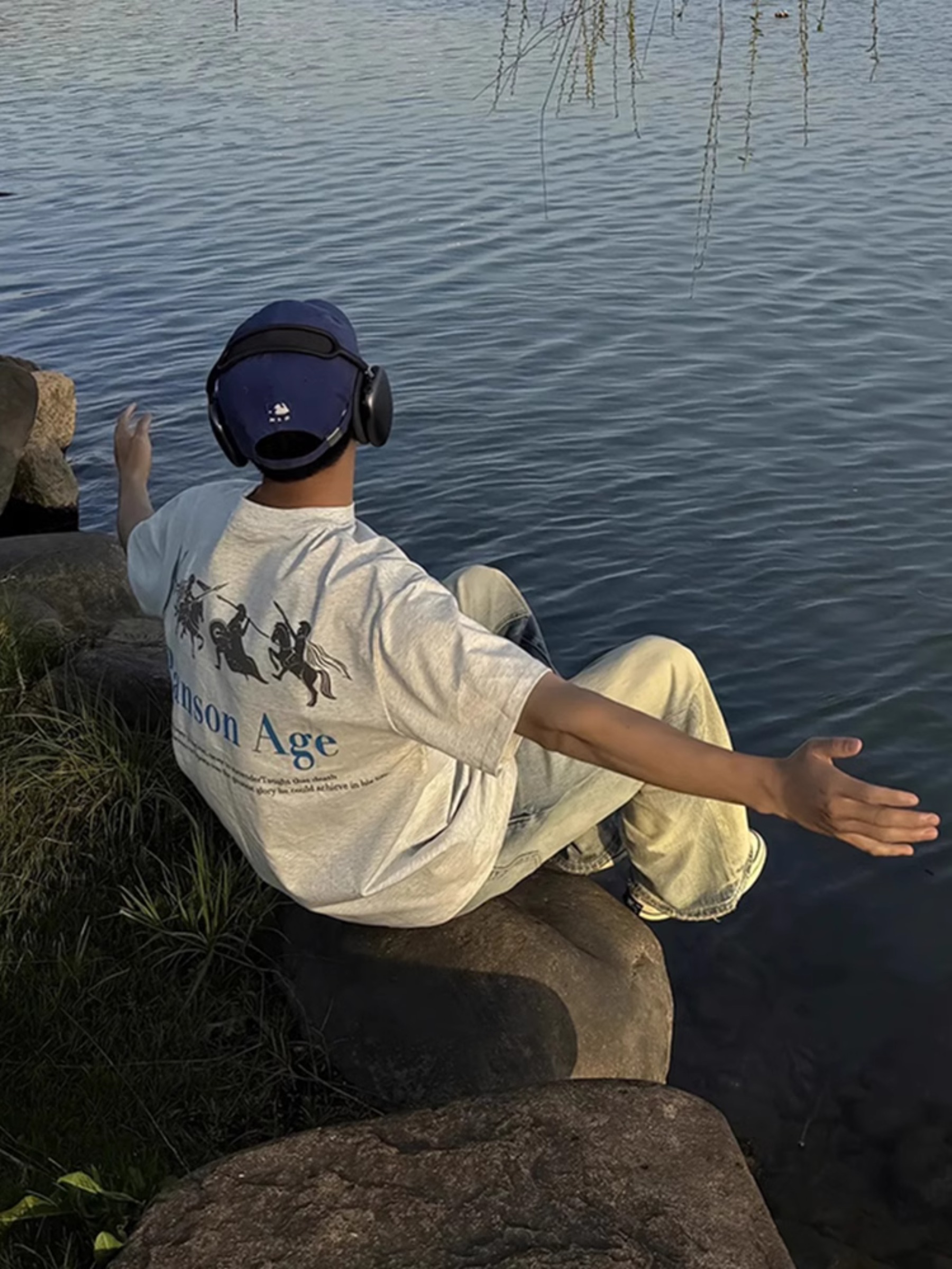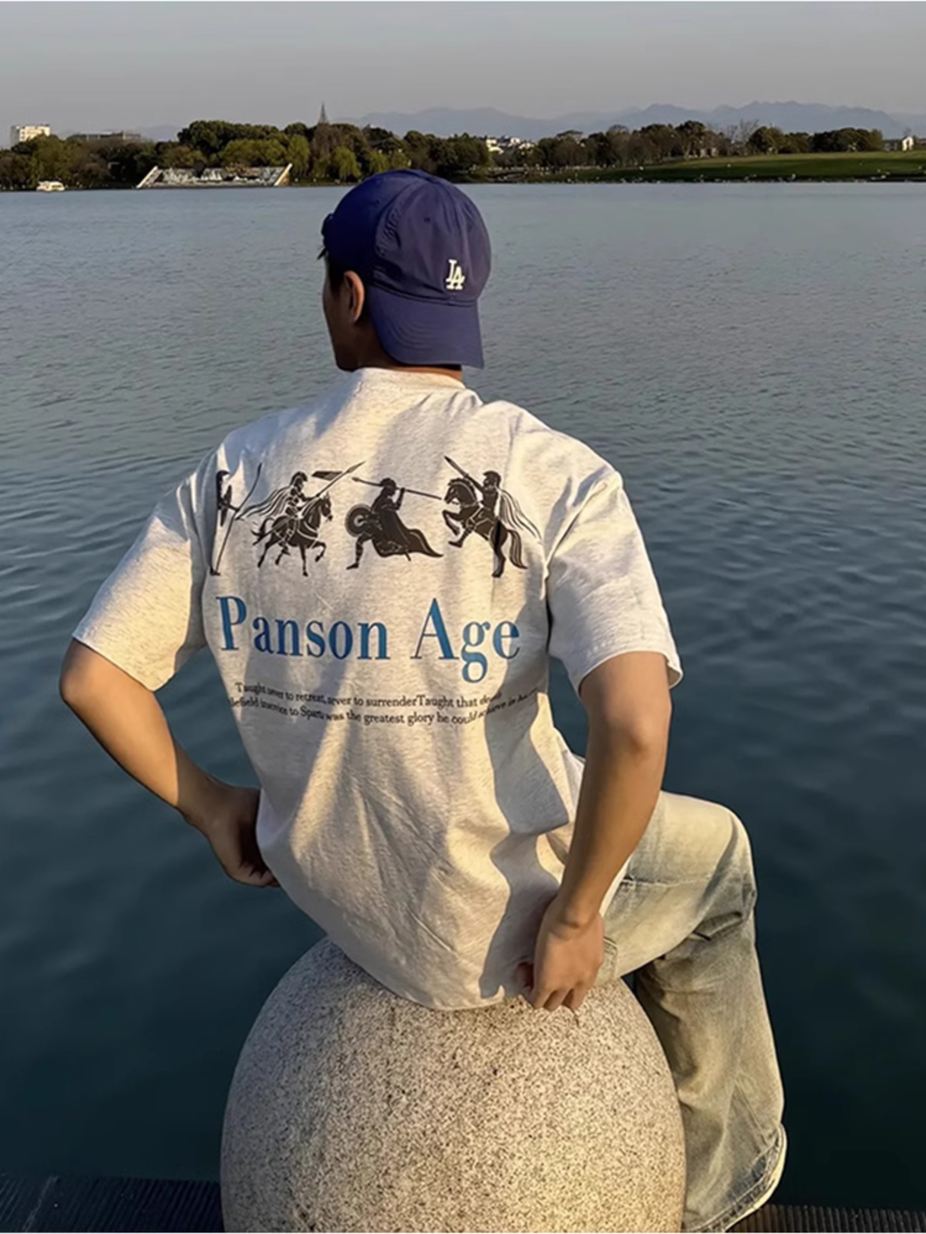 浅灰色斯巴达印花t恤男生夏季美式复古纯棉