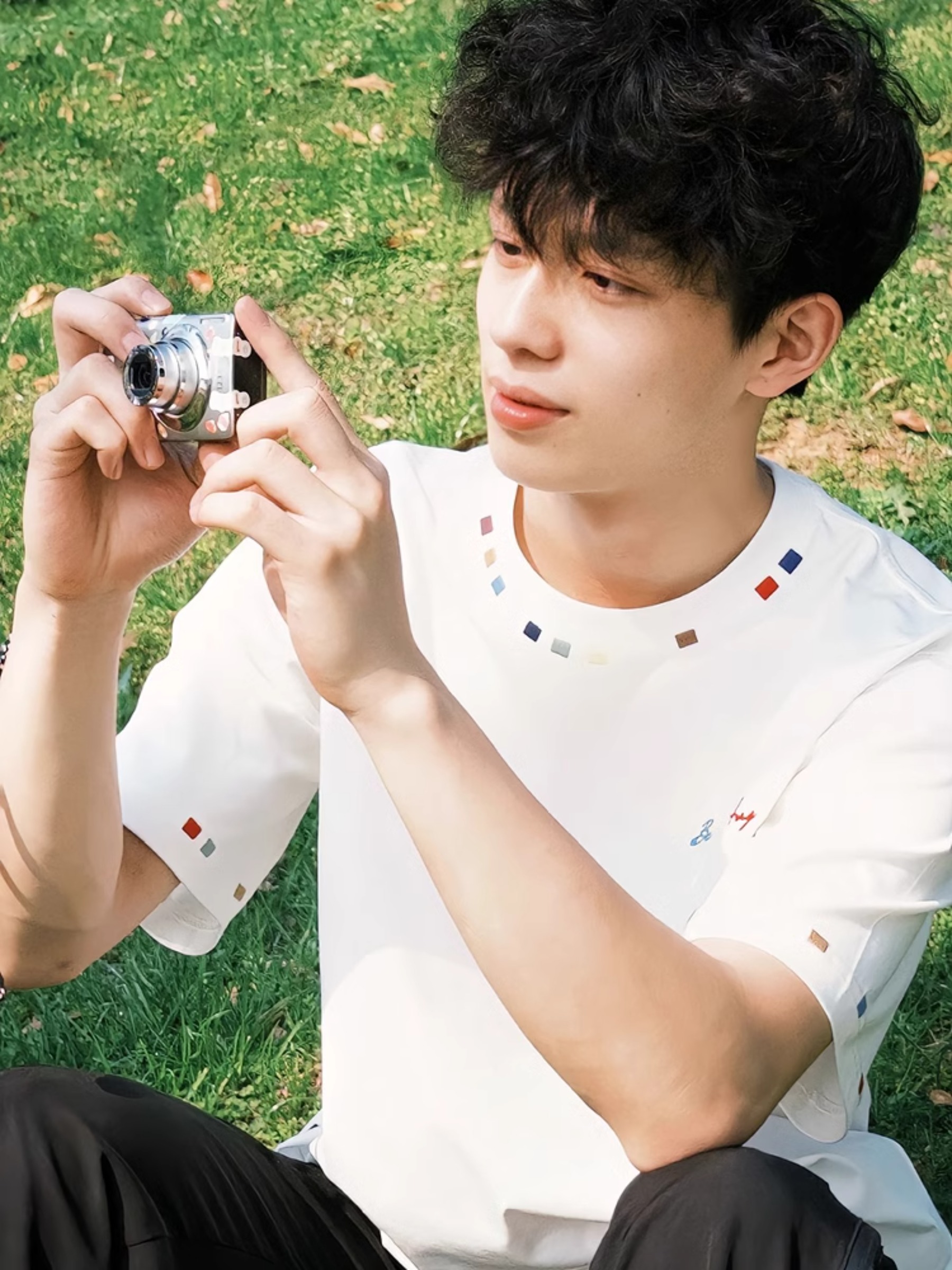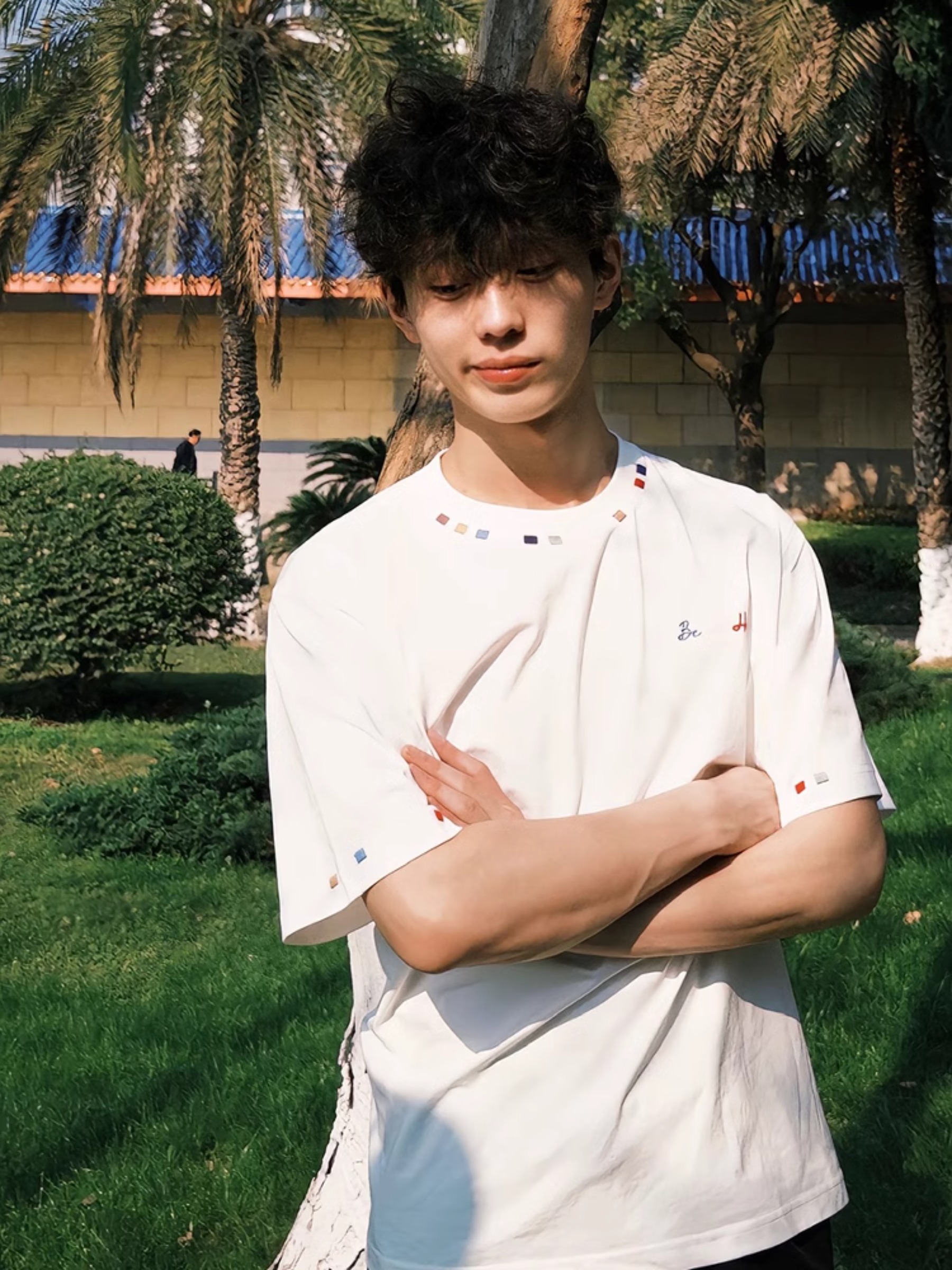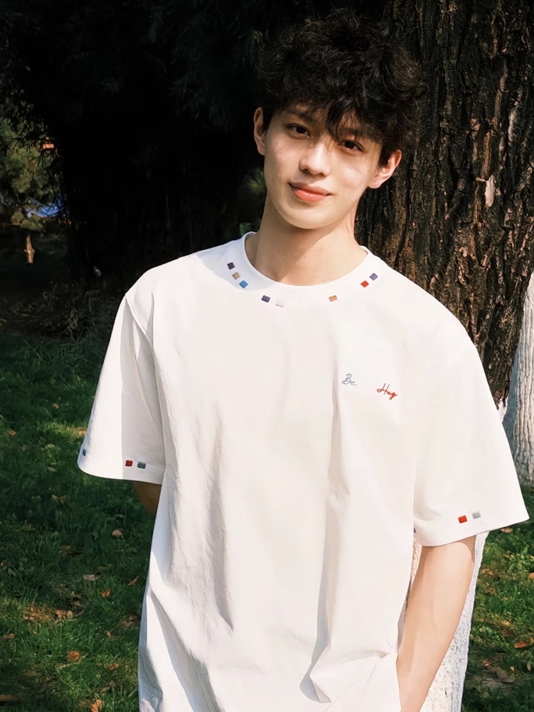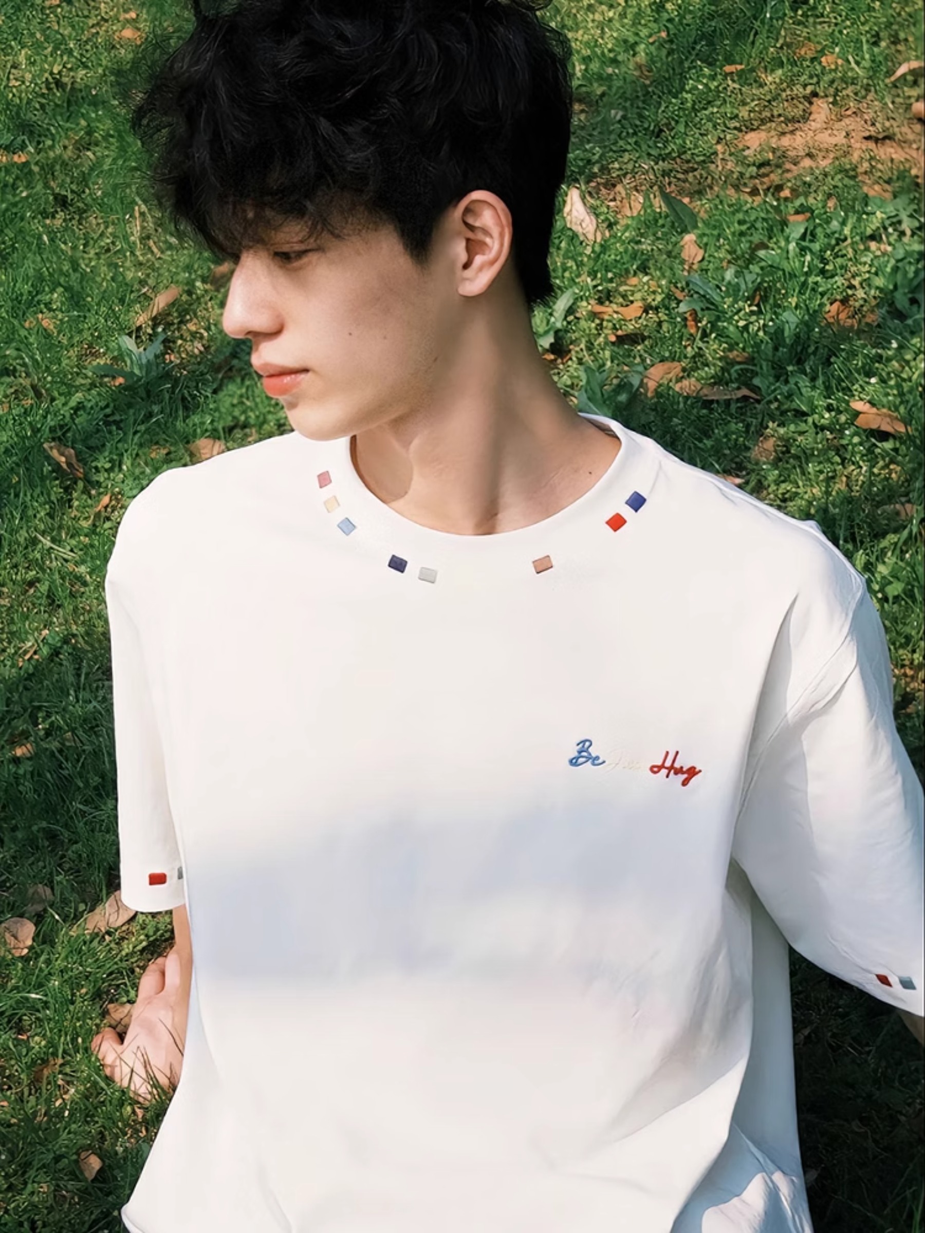 白色彩虹刺绣重磅短袖男夏季高级感小领口半
