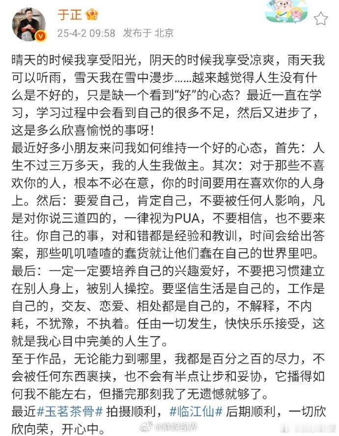 于正晒侯明昊娜扎对视照于正谈如何维持一个好的心态救命!于正这波 “投喂” 太及时,《玉茗茶骨》侯明昊娜扎对视照新鲜出炉。瞅瞅这对视,电流直接穿过屏幕。于正还在文案里揭秘心态维稳攻略,拍摄进度条一路狂飙,我单方面宣布,《玉茗茶骨》预定年度爆款!于正称玉茗茶骨拍摄顺利