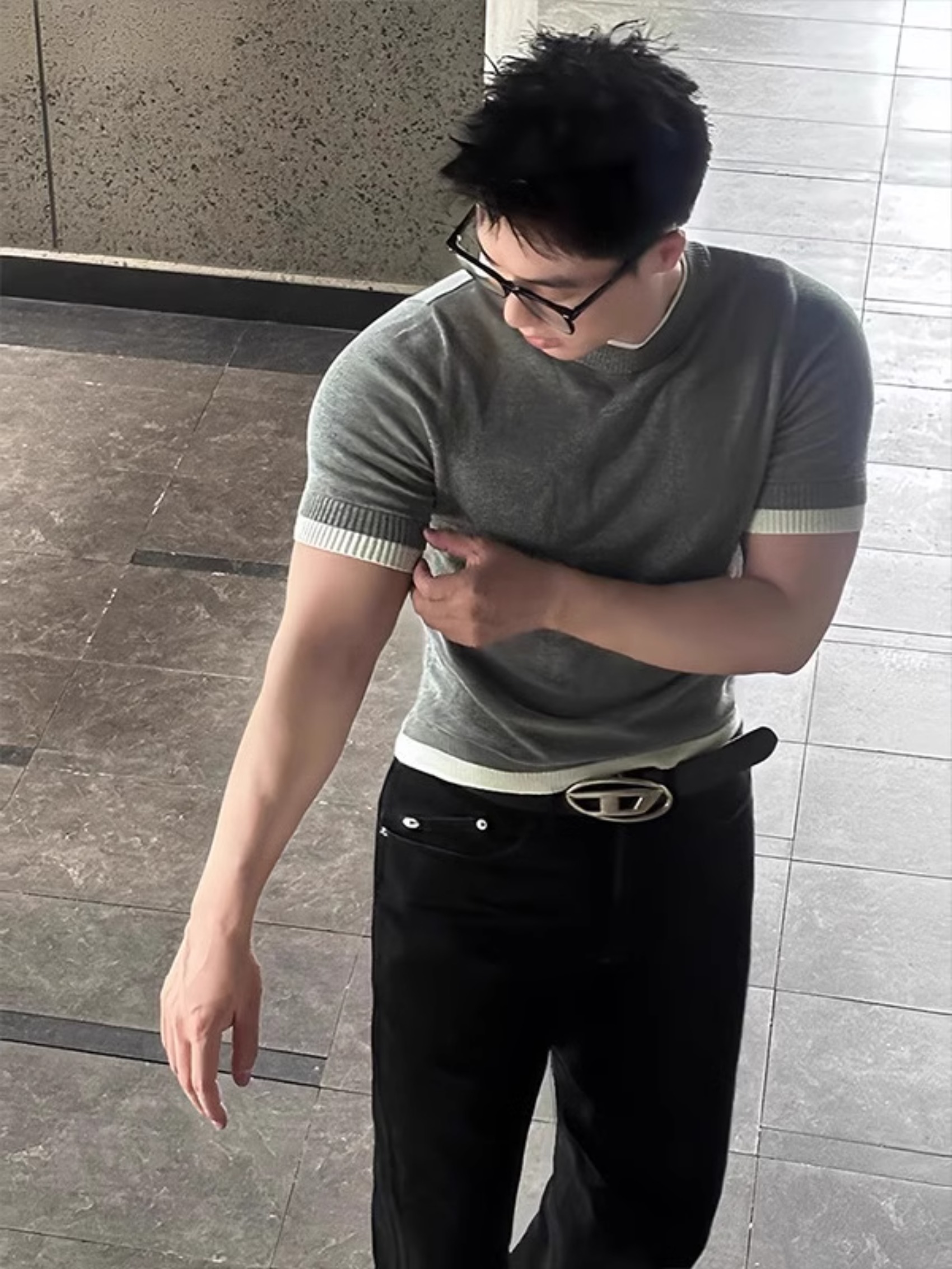修身假两件针织短袖男健身显肌肉收袖口T恤