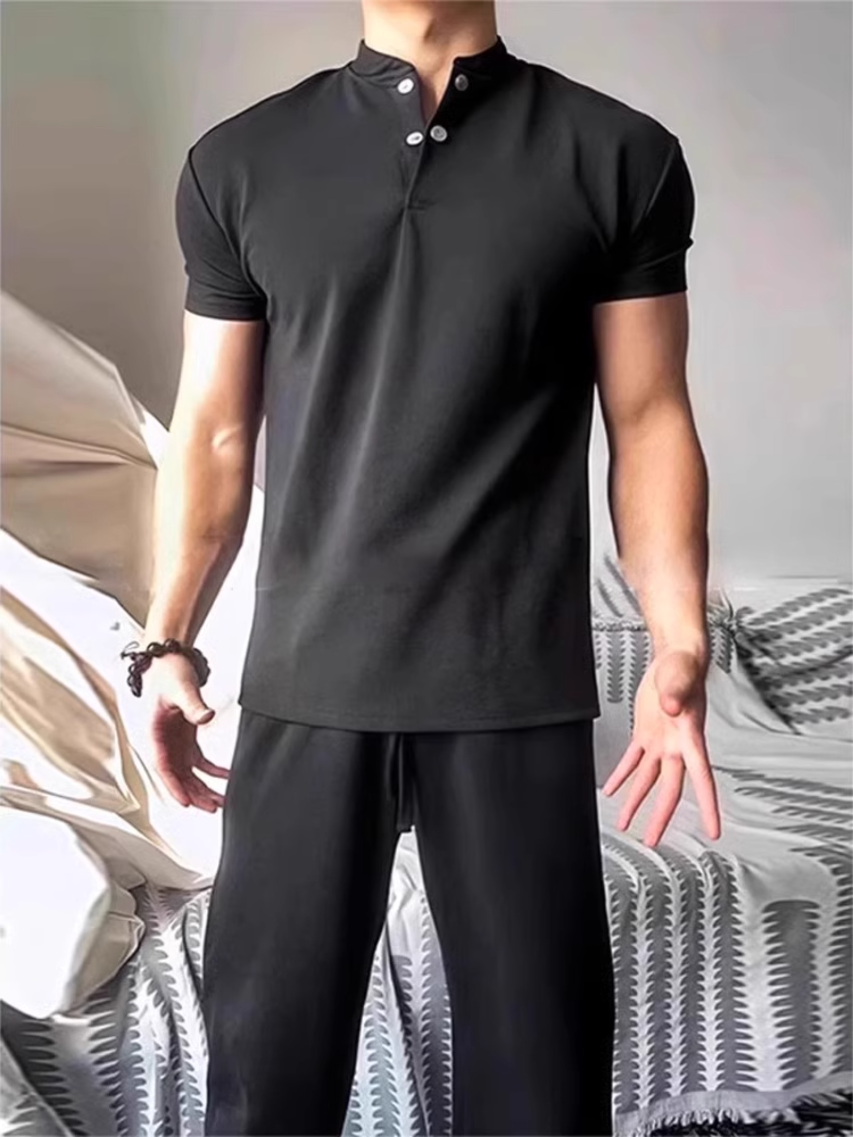 黑色美式亨利领短袖男夏季收紧袖口薄款t恤