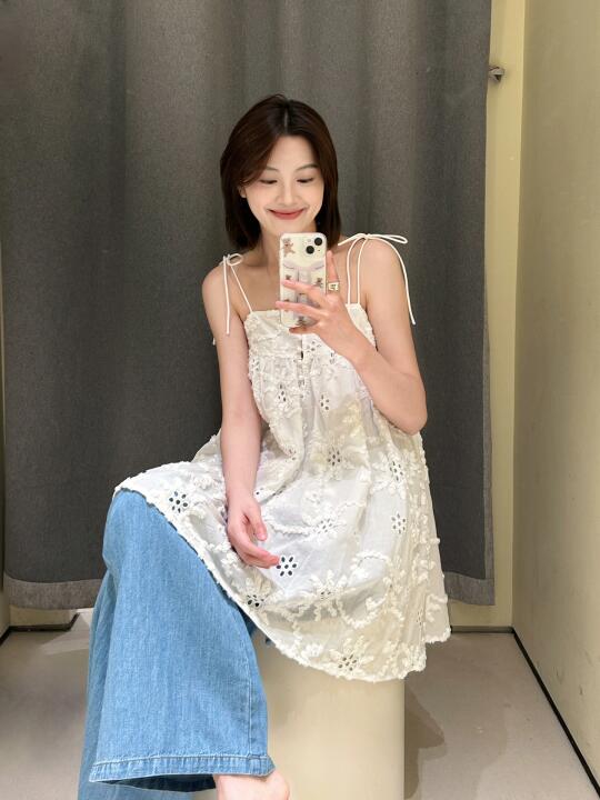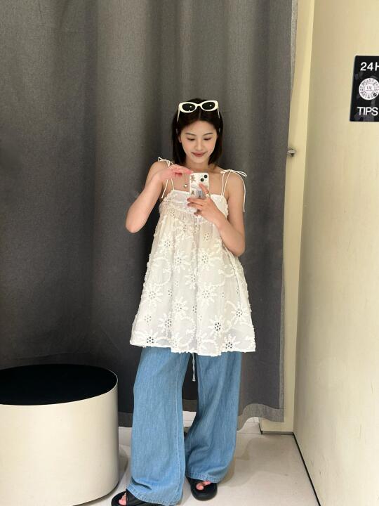 阳光下的她像是从画里走出来的人——长发顺着肩线垂成温柔的弧度,蕾丝抹胸衬得肩颈线