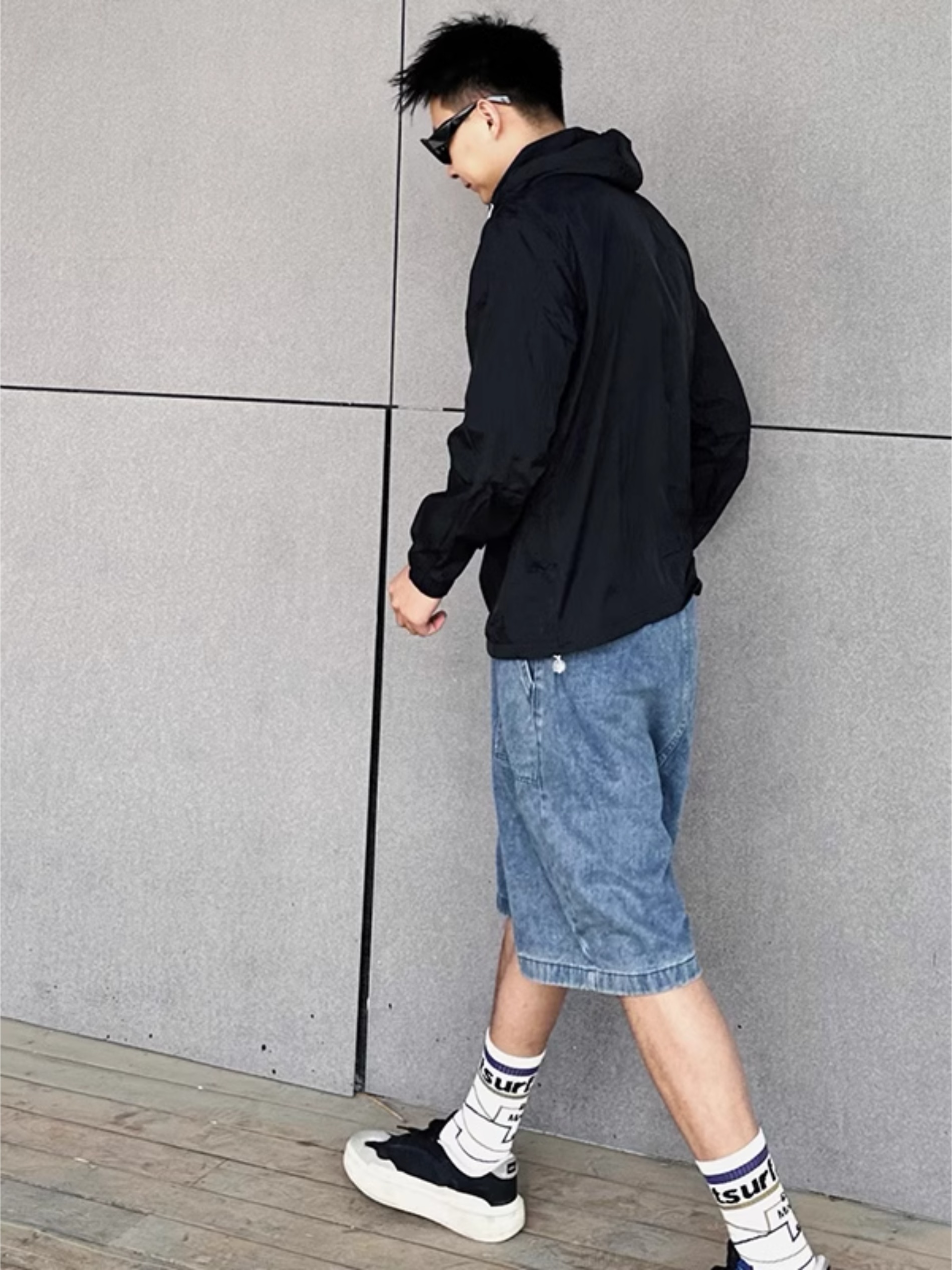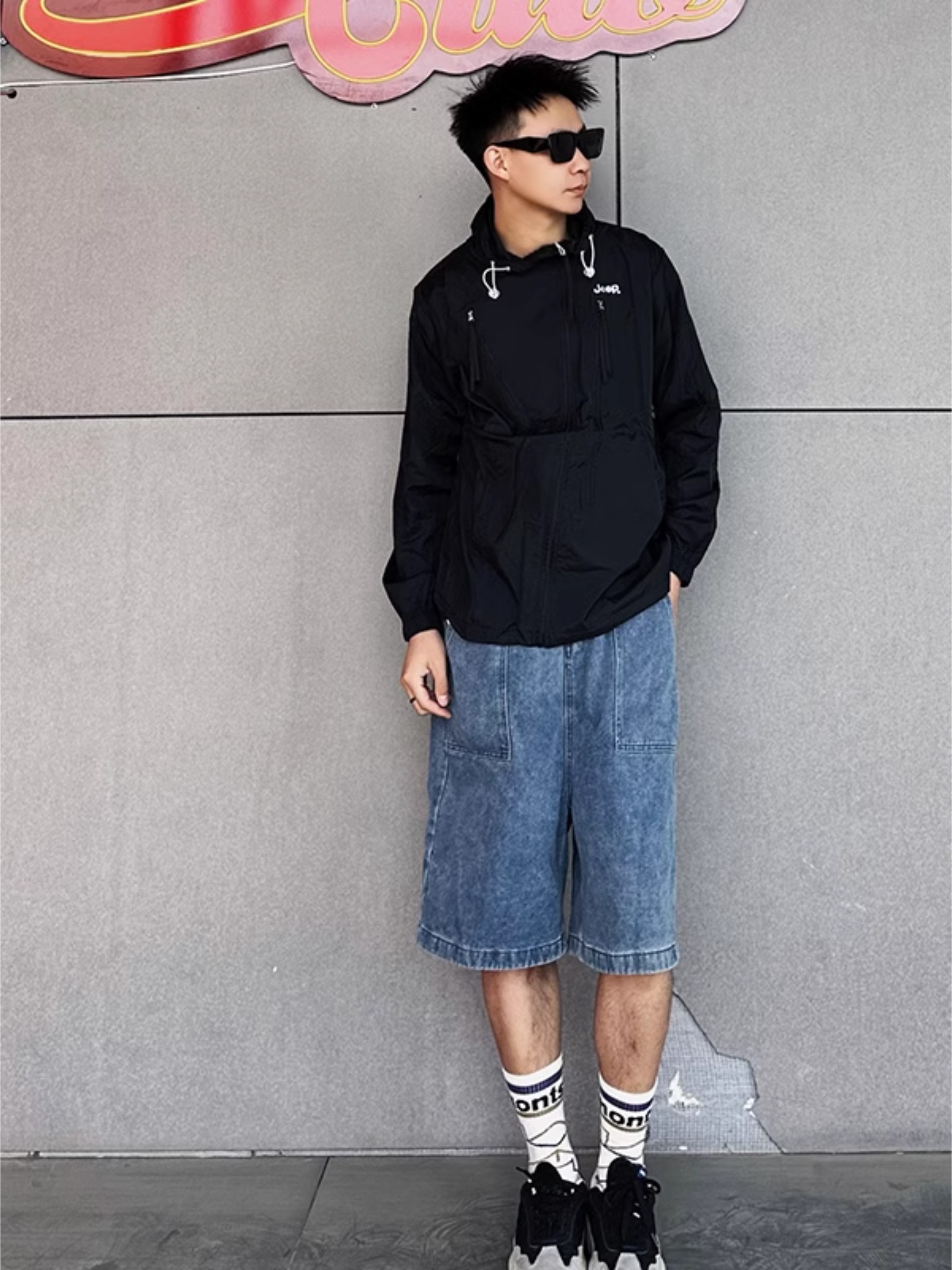 深蓝色廓形牛仔短裤男日系复古潮牌痞帅裤子