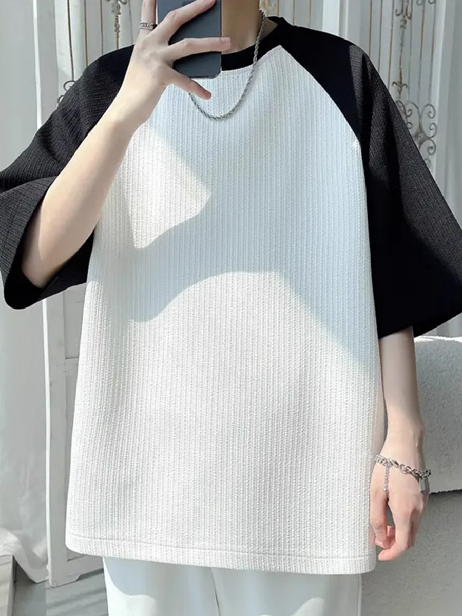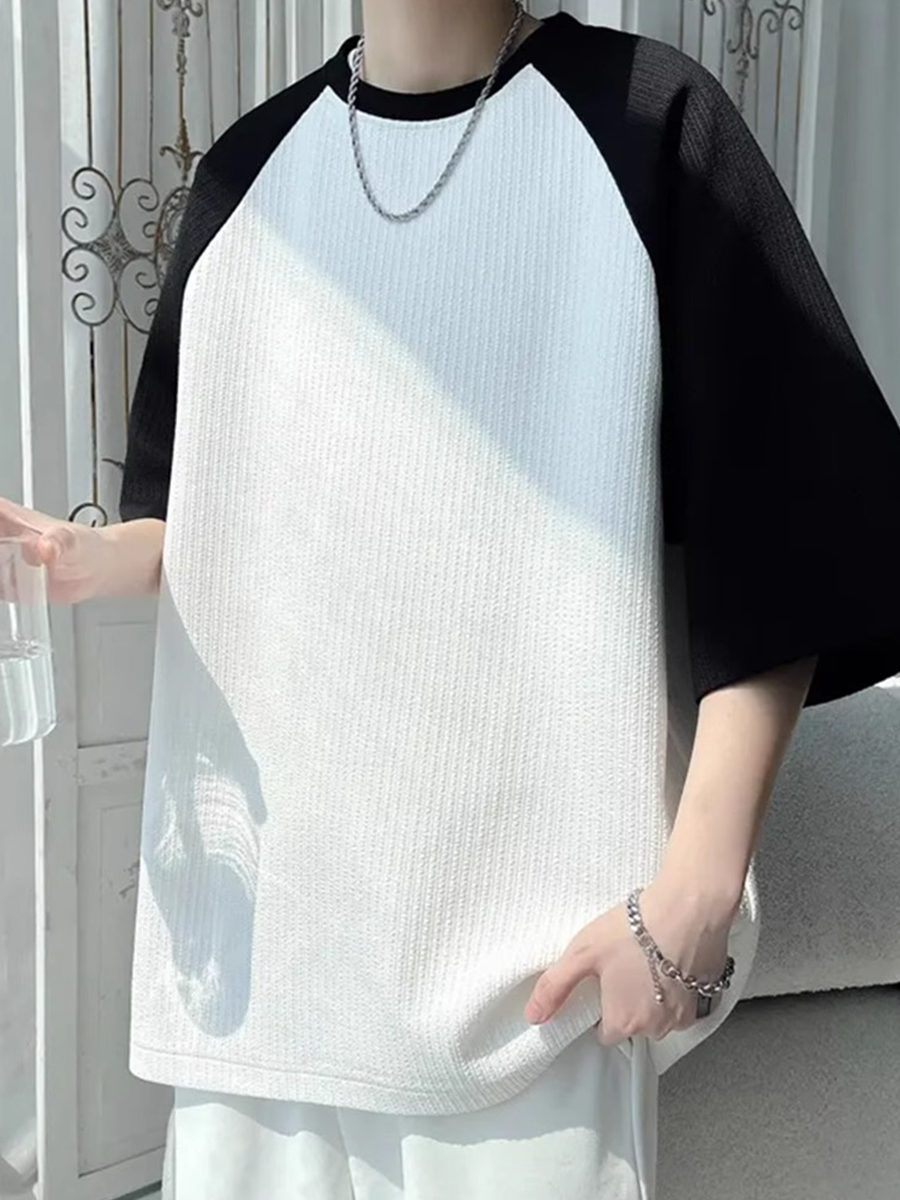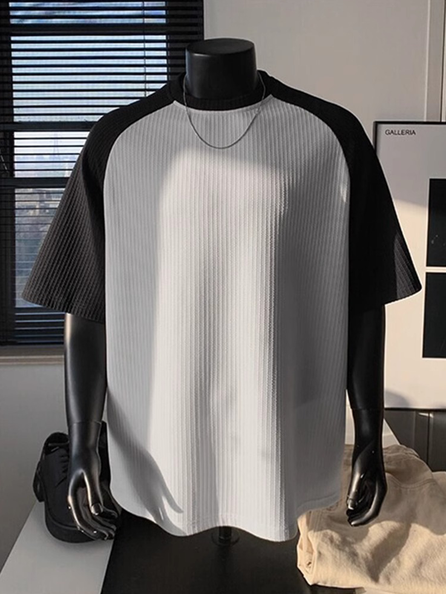 美式细条纹t恤男夏季肌理感撞色插肩短袖c