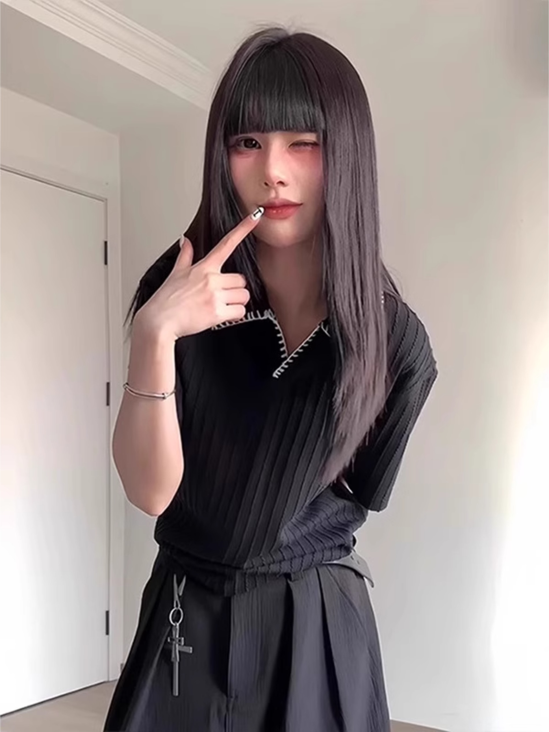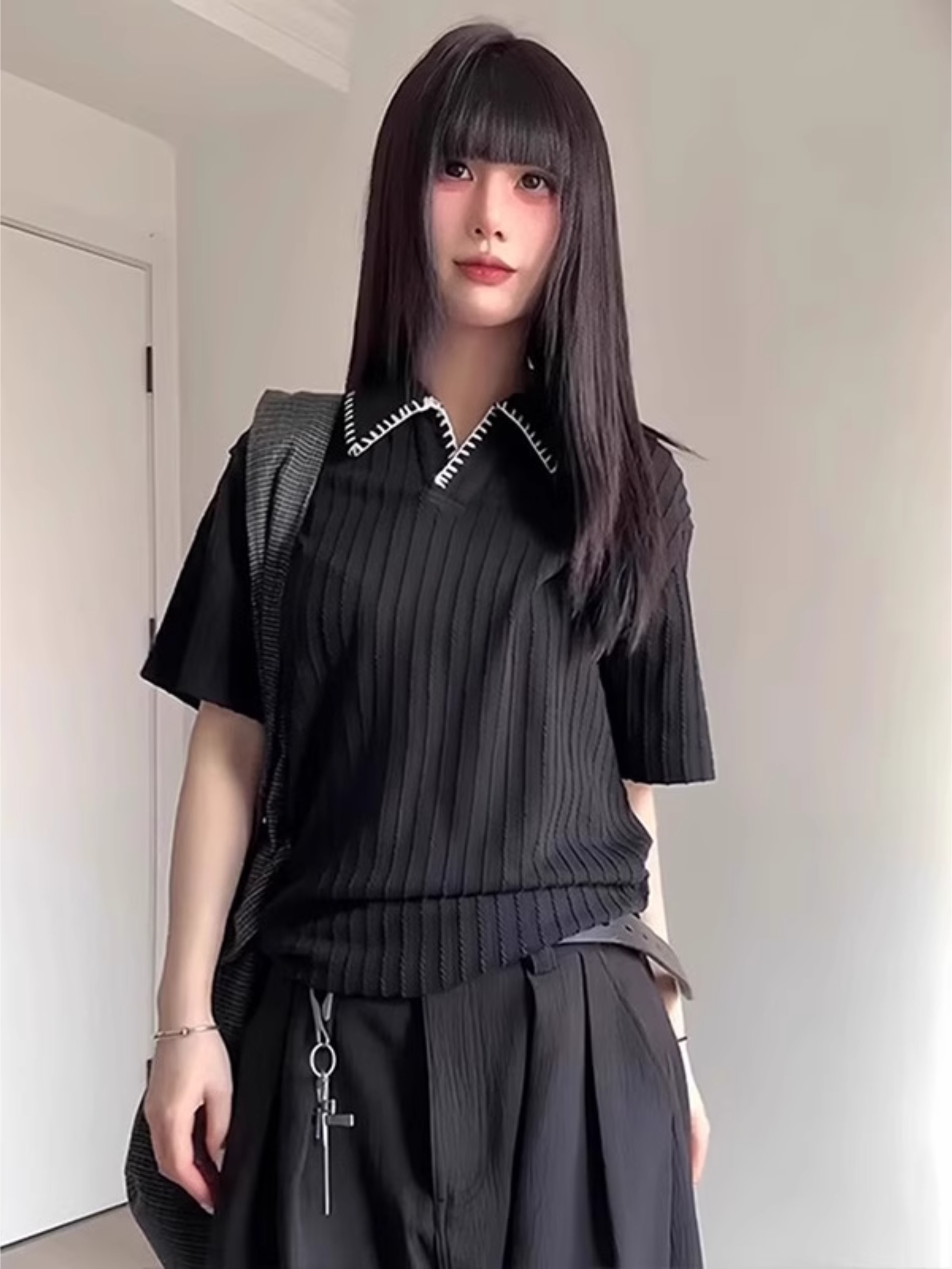 花边V领麦穗纹POLO衫男款肌理感条纹痞