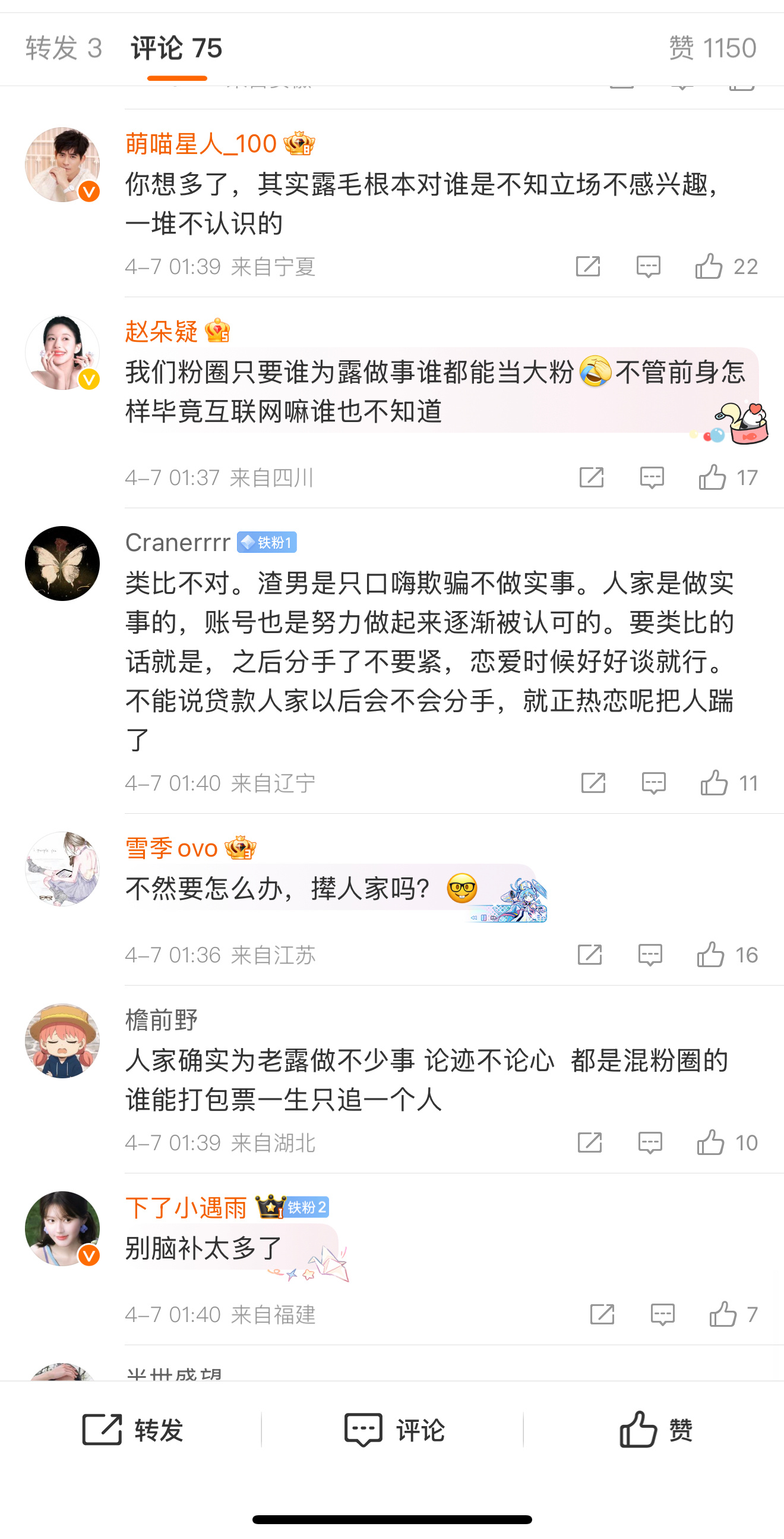 内娱天选omega 被爆出是韩娱粉➕厕号博主➕踩露捧鱼营销号(说赵露思把抑郁症当时尚单品)➕b站up主(安利虞书欣)后,赵露思粉丝对她维护的态度,这格局可露丽你们是马云。[赞]
