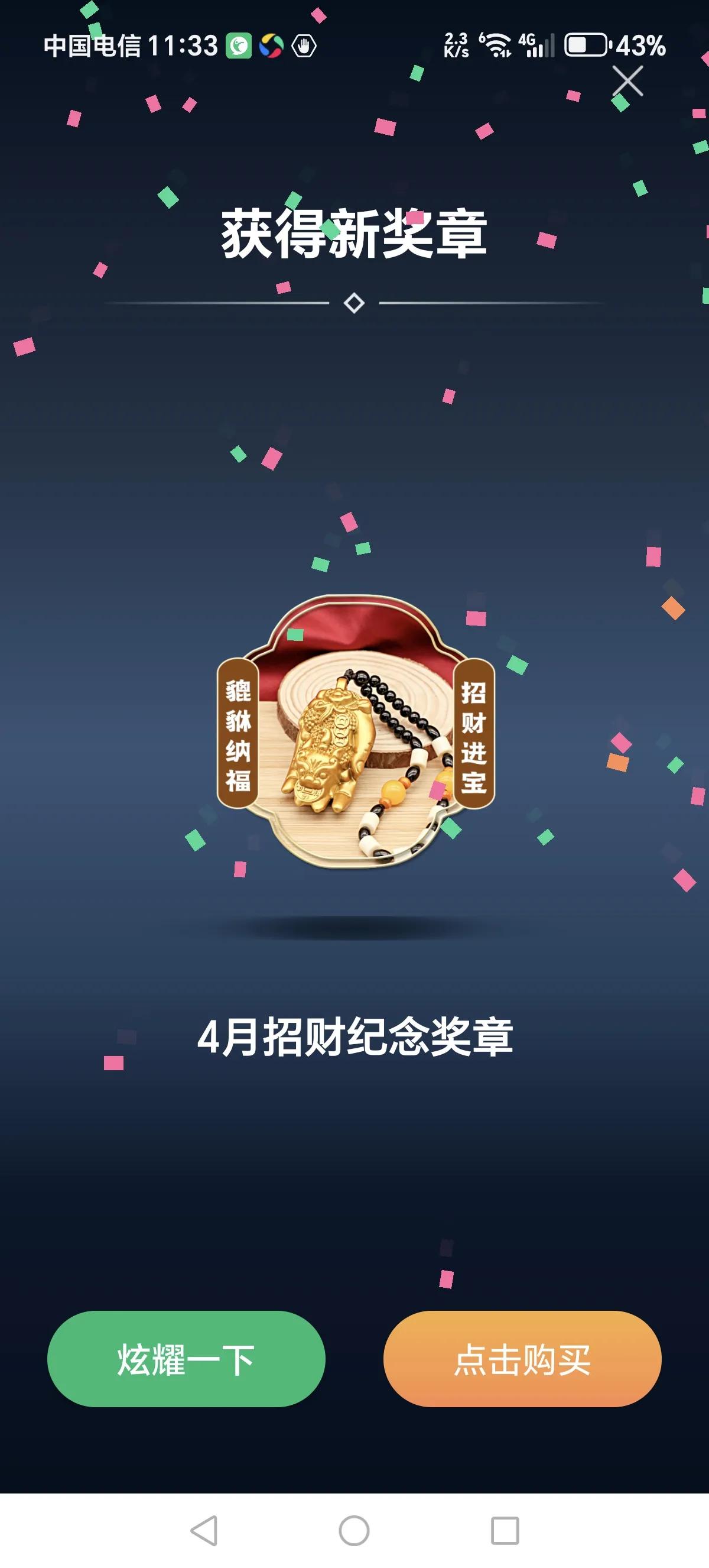 听人说,减量慢跑是治疗跟腱炎的最好方法。听人劝吃饱饭,今天只跑了7.07公里,坚持一段时间看看是否见效。 今天跑步收获一枚《4月招财纪念奖章》,但愿财源滚滚![祈祷]