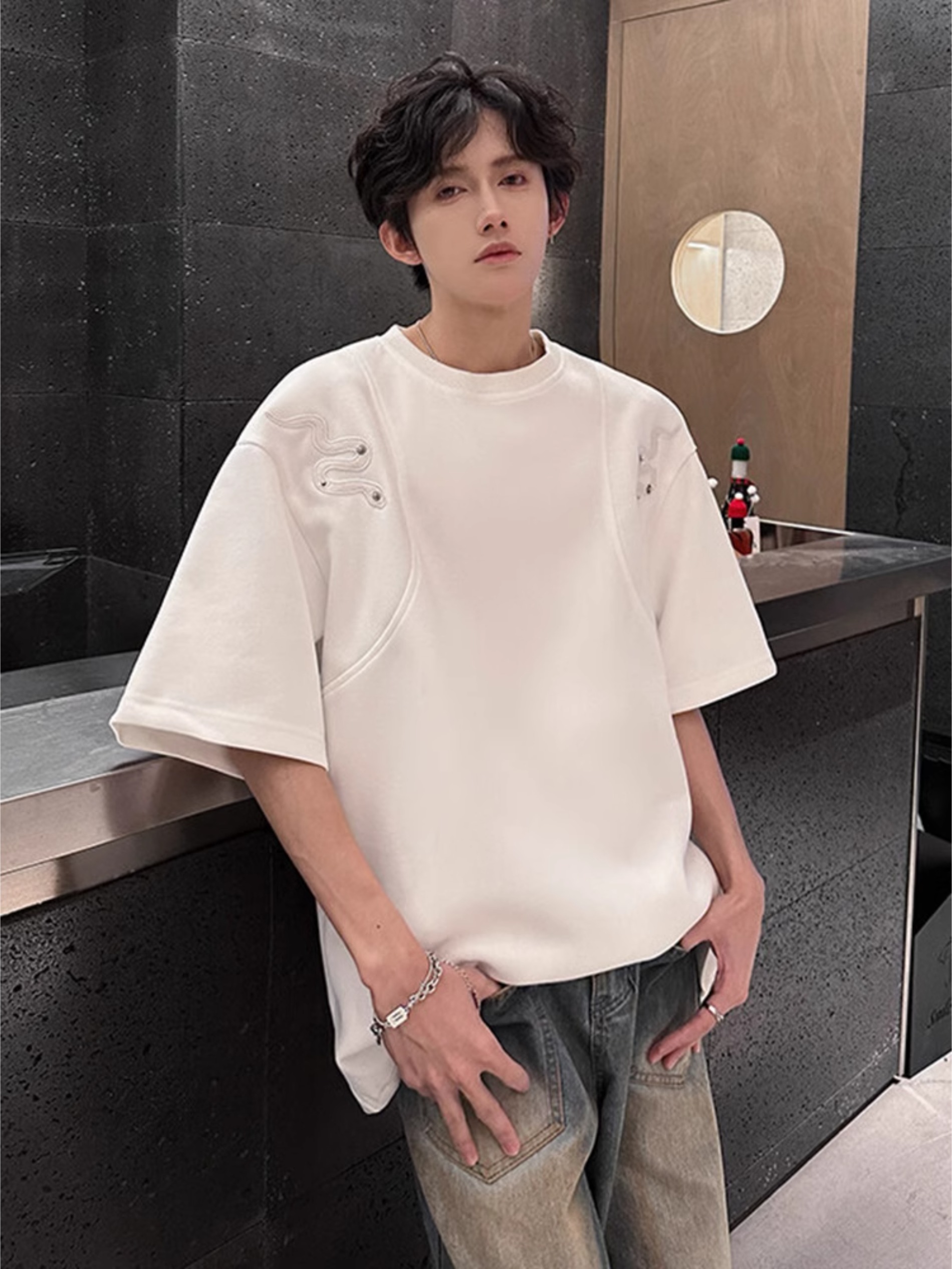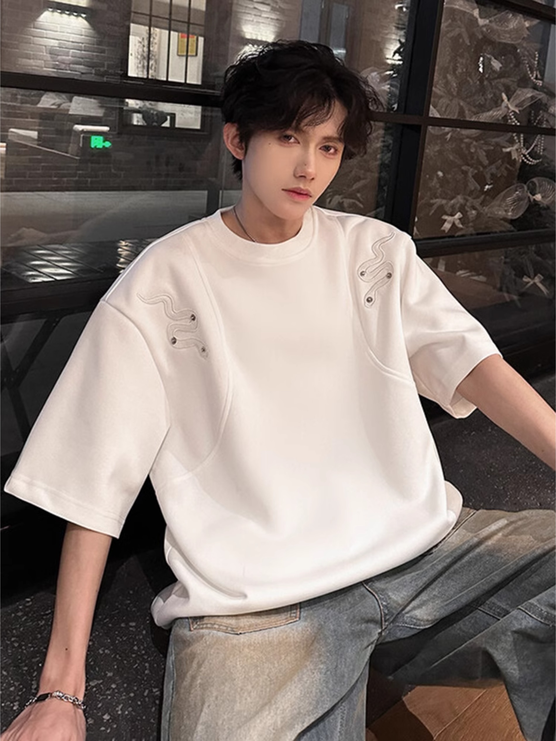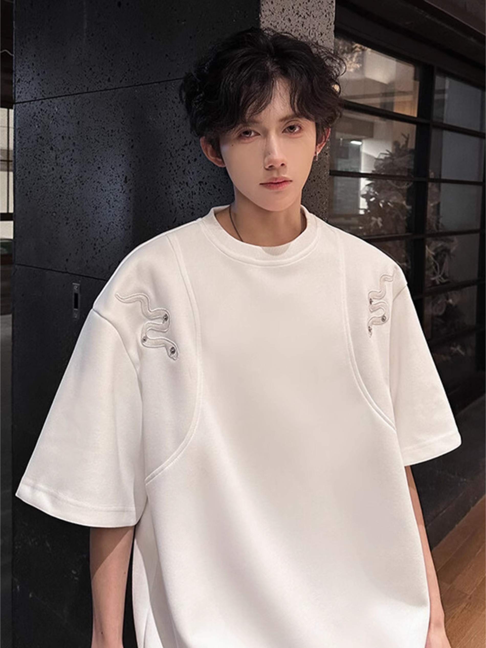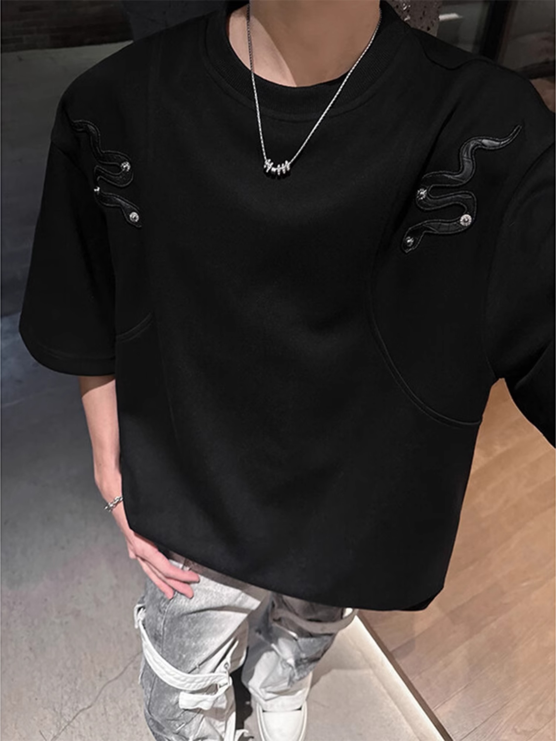 铆钉蛇纹贴布短袖男款夏季美式高街解构设计