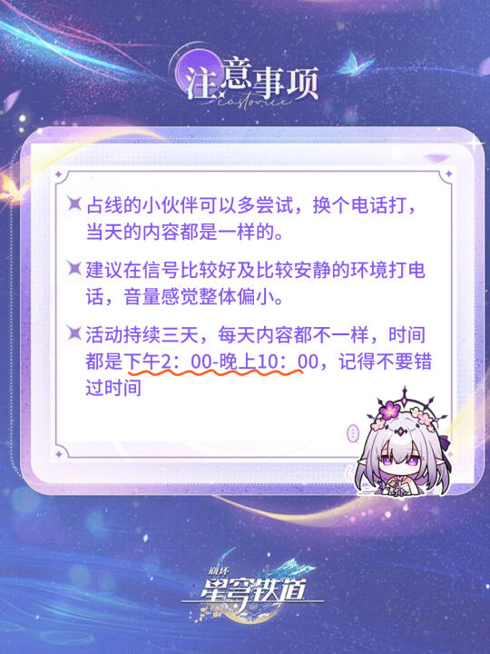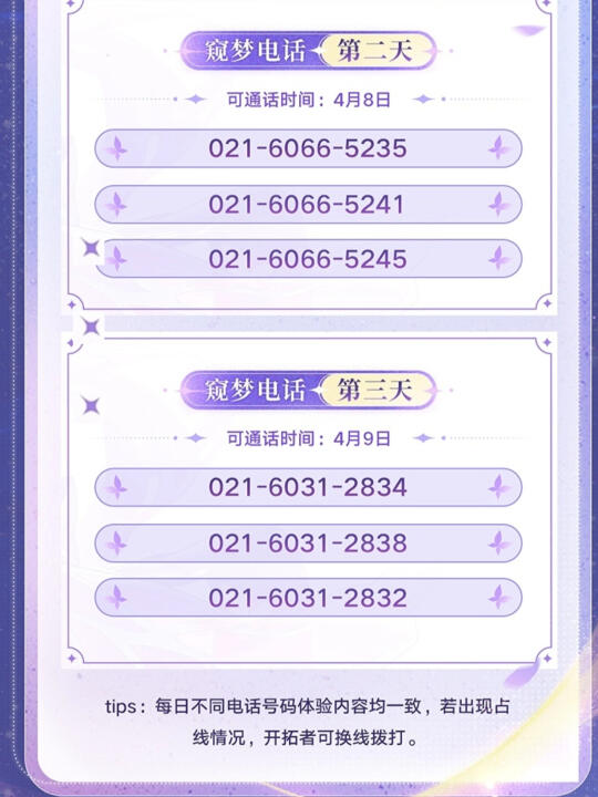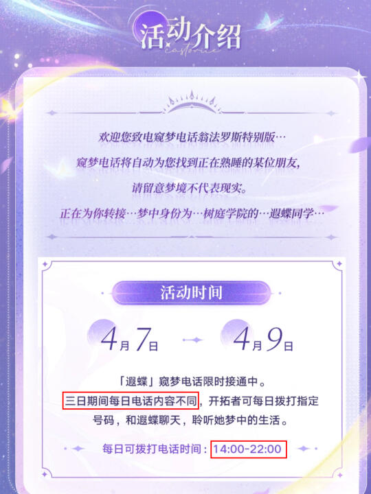 今天明天后天每天下午2点-晚上10点 都可以给遐蝶打电话 和遐蝶唠嗑,听遐蝶的猫叫 三天的内容都不一样 窥梦电话转接的是神庭学院的遐蝶同学 和现在的版本很不一样哦,第一天遐蝶还会学猫叫,没听过赶紧去