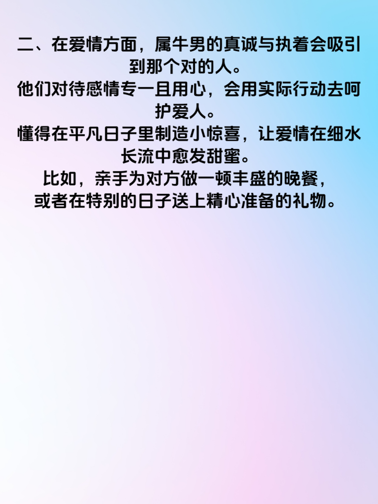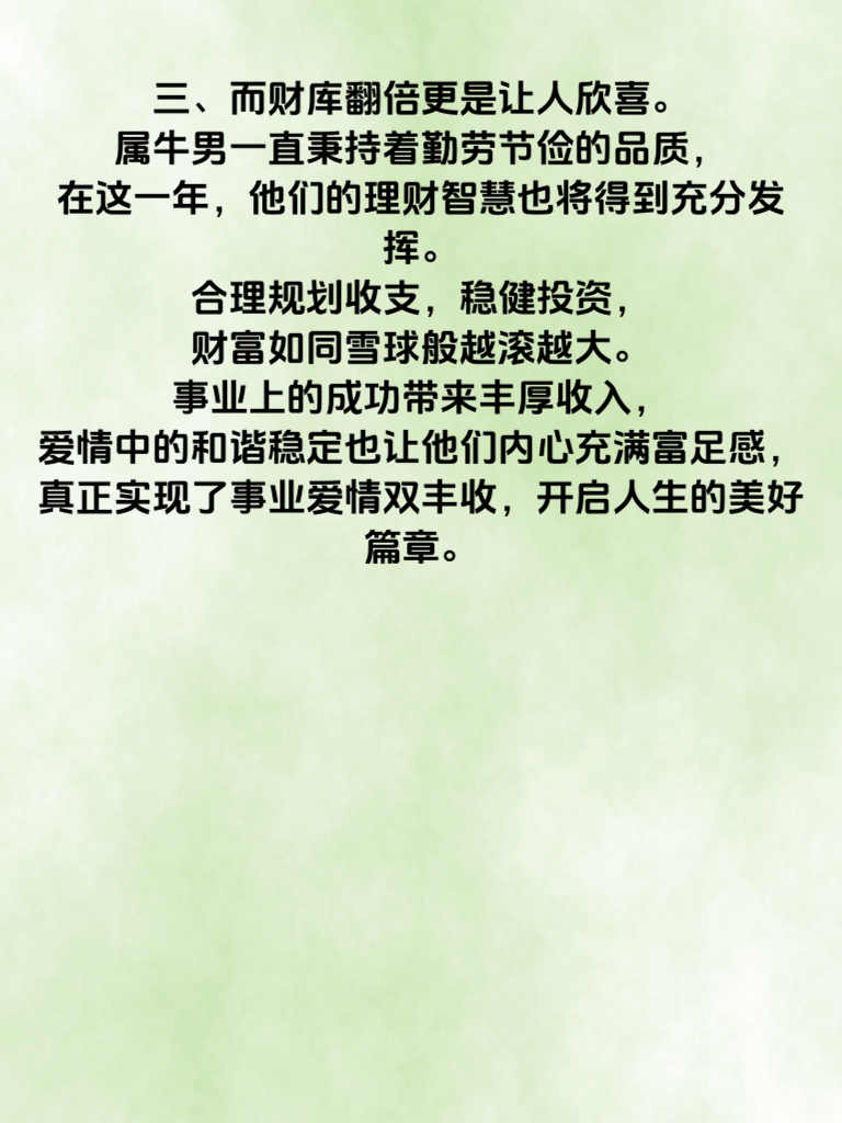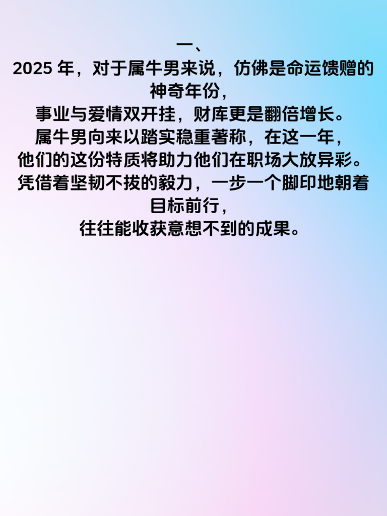 一、2025 年,对于属牛男来说,仿佛是命运馈赠的神奇年份,事业与爱情双开挂,财库更是翻倍增长。属牛男向来以踏实稳重著称,在这一年,他们的这份特质将助力他们在职场大放异彩。凭借着坚韧不拔的毅力,一步一个脚印地朝着目标前行,往往能收获意想不到的成果。 二、在爱情方面,属牛男的真诚与执着会吸引到那个对的人。他们对待感情专一且用心,会用实际行动去呵护爱人。懂得在平凡日子里制造小惊喜,让爱情在细水长流中愈发甜蜜。比如,亲手为对方做一顿丰盛的晚餐,或者在特别的日子送上精心准备的礼物。 三、而财库翻倍更是让人欣喜。属牛男一直秉持着勤劳节俭的品质,在这一年,他们的理财智慧也将得到充分发挥。合理规划收支,稳健投资,财富如同雪球般越滚越大。事业上的成功带来丰厚收入,爱情中的和谐稳定也让他们内心充满富足感,真正实现了事业爱情双丰收,开启人生的美好篇章。