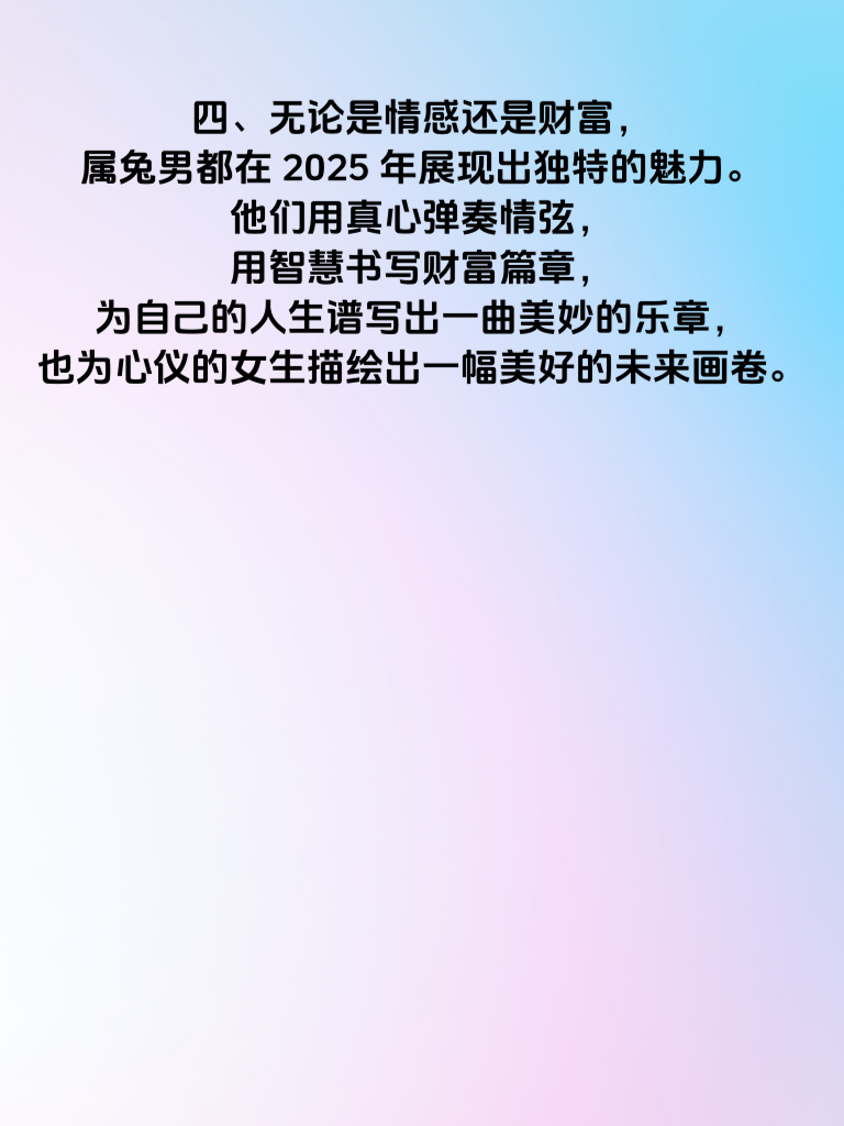 一、2025 年,对于属兔男来说,是情感与财富交织的一年。在情场上,他们如灵动的兔子,能巧妙地拨动情弦,奏响清音。属兔男心思细腻,善于倾听女生的心声,能敏锐捕捉她们的情绪变化。 二、追求女生时,他们会用温柔且真诚的话语,给予对方无尽的关怀。比如在女生疲惫时,送上贴心的问候,准备一份小惊喜,让她感受到温暖与爱意。这种细腻的情感表达,恰似轻柔的音符,缓缓流入女生的心间,撩动那根最柔软的情弦。 三、而在财富方面,属兔男也有着独特的机遇。他们会凭借自身的智慧与努力,在财笺上落墨生金。懂得合理规划理财,不放过任何一个潜在的赚钱机会。有了坚实的物质基础,在追求爱情的道路上也更有底气。 四、无论是情感还是财富,属兔男都在 2025 年展现出独特的魅力。他们用真心弹奏情弦,用智慧书写财富篇章,为自己的人生谱写出一曲美妙的乐章,也为心仪的女生描绘出一幅美好的未来画卷。