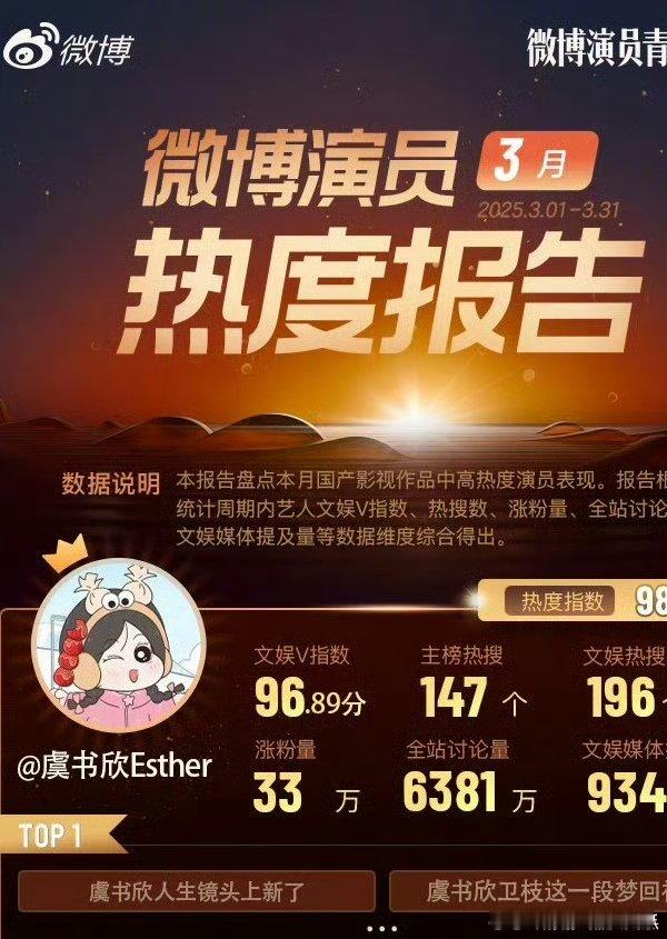 虞书欣3月微博演员热度TOP1厉害啊虞书欣,3 月微博演员热度直接登顶,《嘘国王在冬眠》一路热搜,主榜 147,文娱 196,还涨粉 33W,95 后顶流的实力展现得淋漓尽致,爱了爱了虞书欣3月微博演员热度登顶