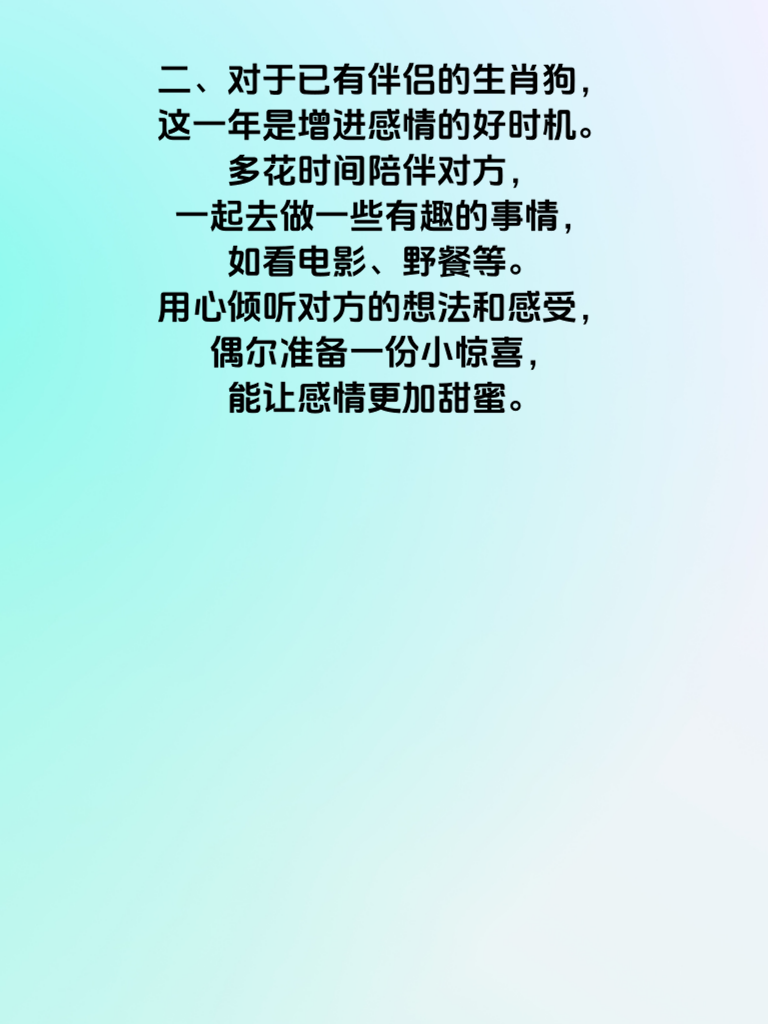 一、2025 年对于生肖狗的朋友们来说,情感运势可谓一片光明,情缘缠绵甜如蜜。在这一年里,单身的狗狗们会有许多浪漫的邂逅机会。要学会主动展现自己的魅力,真诚待人。比如参加一些社交活动时,保持自信的微笑,积极与他人交流互动,说不定就能遇到那个让你心动的她。 二、对于已有伴侣的生肖狗,这一年是增进感情的好时机。多花时间陪伴对方,一起去做一些有趣的事情,如看电影、野餐等。用心倾听对方的想法和感受,偶尔准备一份小惊喜,能让感情更加甜蜜。 三、在财运方面,2025 生肖狗财路平坦稳如山。工作上会有不错的机遇,要抓住机会努力拼搏,积极展现自己的能力。理财时保持稳健的态度,不盲目投资。可以适当进行一些合理的储蓄计划,为未来的生活打下坚实的经济基础,让感情和生活都因稳定的财富而更加美好。
