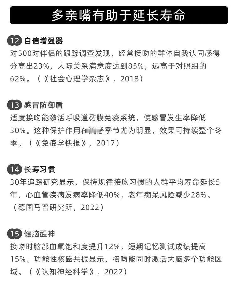 💞 多亲嘴有助于延长寿命,学会了么? 健康向上的关系不仅能让人心情愉悦,还有助于身体健康。 不管是长辈对子女的吻,还是恋人之间的吻,都在表达爱意的同时也让自己变得更好了。亲密感技巧 吻口 因“亲嘴”时间长导致女友被查出酒驾
