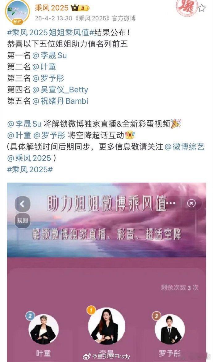 李晟三次个人第一 乘风2025李晟在《乘风 2025》中大放异彩,三次获得个人第一,分别在初舞台全民评级、乘风助力值以及微博喜爱度中取得优异成绩。从 “小燕子” 到现在的舞台强者,她的每一次努力都在积累能量,如今的三次第一就是她努力的最好见证,相信她在未来的舞台上会继续发光发热。