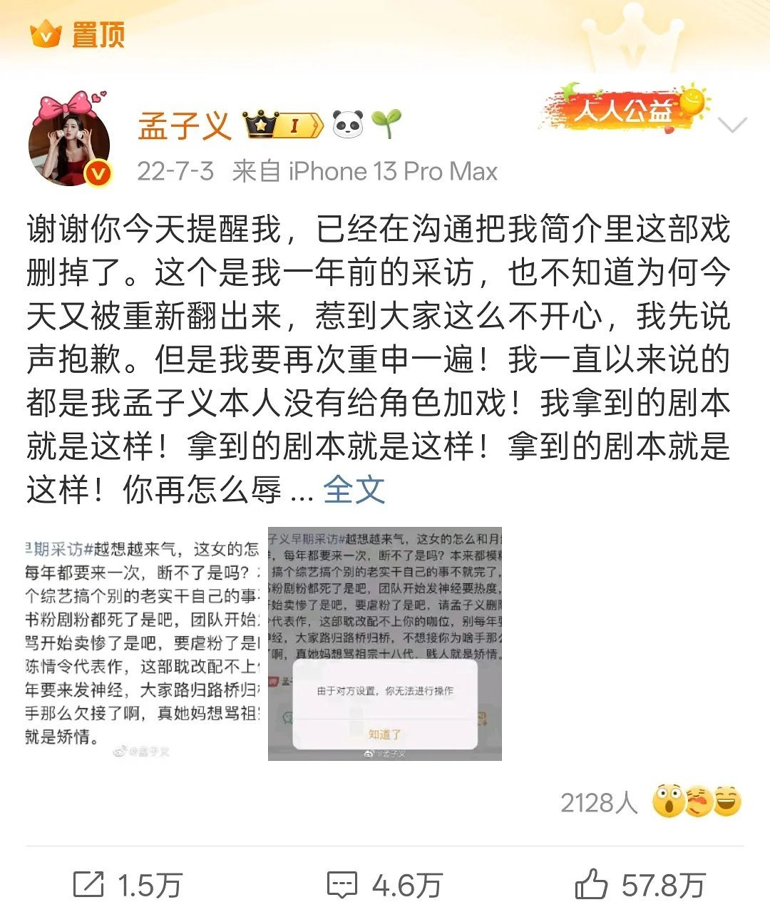 📮孟子义把回应《陈情令》加戏的博文置顶了。
