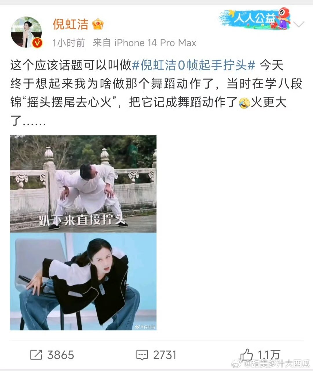 倪虹洁[超话]倪虹洁0帧起手拧头乘风2025家人们,倪虹洁舞蹈动作和八段锦“摇头摆尾去心火”的联动太绝,笑到不行 。