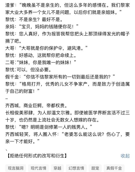 真千金渡劫失败穿回来后,摆烂了 女主修仙渡劫失败穿回真千金,认命了,除了爱喝苦茶外,情绪稳定,对一般人或事持无所谓态度,但对惹到自己的,解决地干脆利落。 男主一张嘴毒四方,对谁都贱兮兮的,但女主面前就是渴望爱的执着狗狗。 一个短篇小甜文,男二属实没必要。 男二没有任何过界行为,只是被察觉了对女主的感情,男主就派人跟踪、在生意上进行打压、甚至想让助理撞人,态度和行为很上不了台面,魅力大减。