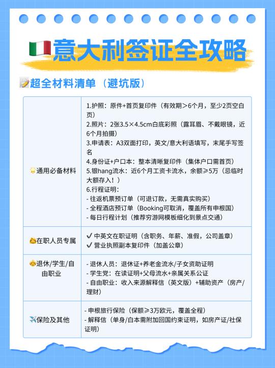- 申根旅行保险(保额≥3万欧元,覆盖全程)