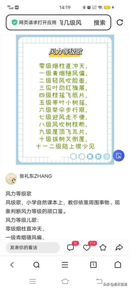 风力歌 零级烟柱直冲天, 一级轻烟随风偏。 二级轻风吹脸面, 三级叶动红旗展。 四级枝摇飞纸片, 五级带叶小树摇。 六级举伞步行艰, 七级迎风走不便。 八级风吹树枝断, 九级屋顶飞瓦片。 十级拔树又倒屋, 十一二级陆少见。 不知道现在报导的15级是怎么算出来的?
