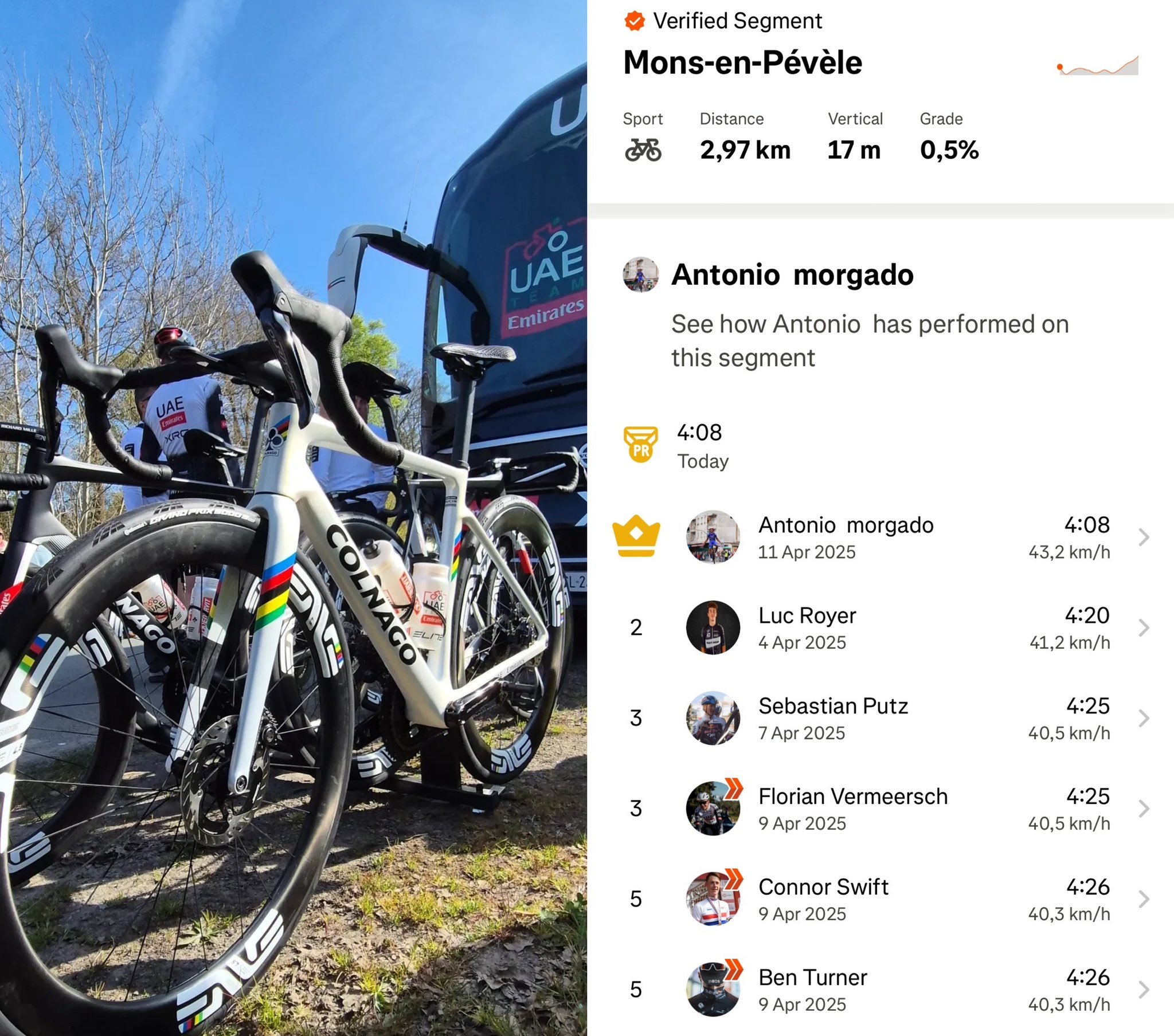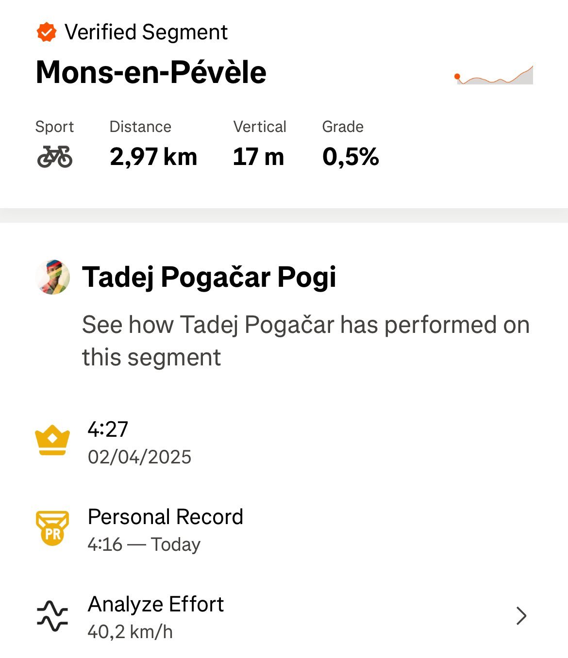 波加查的Strava 蒙桑佩维勒(巴黎鲁贝第二段五星石头路)用时又刷新(但没有mou说的那么夸张,不知道是没上传还是mou夸大)