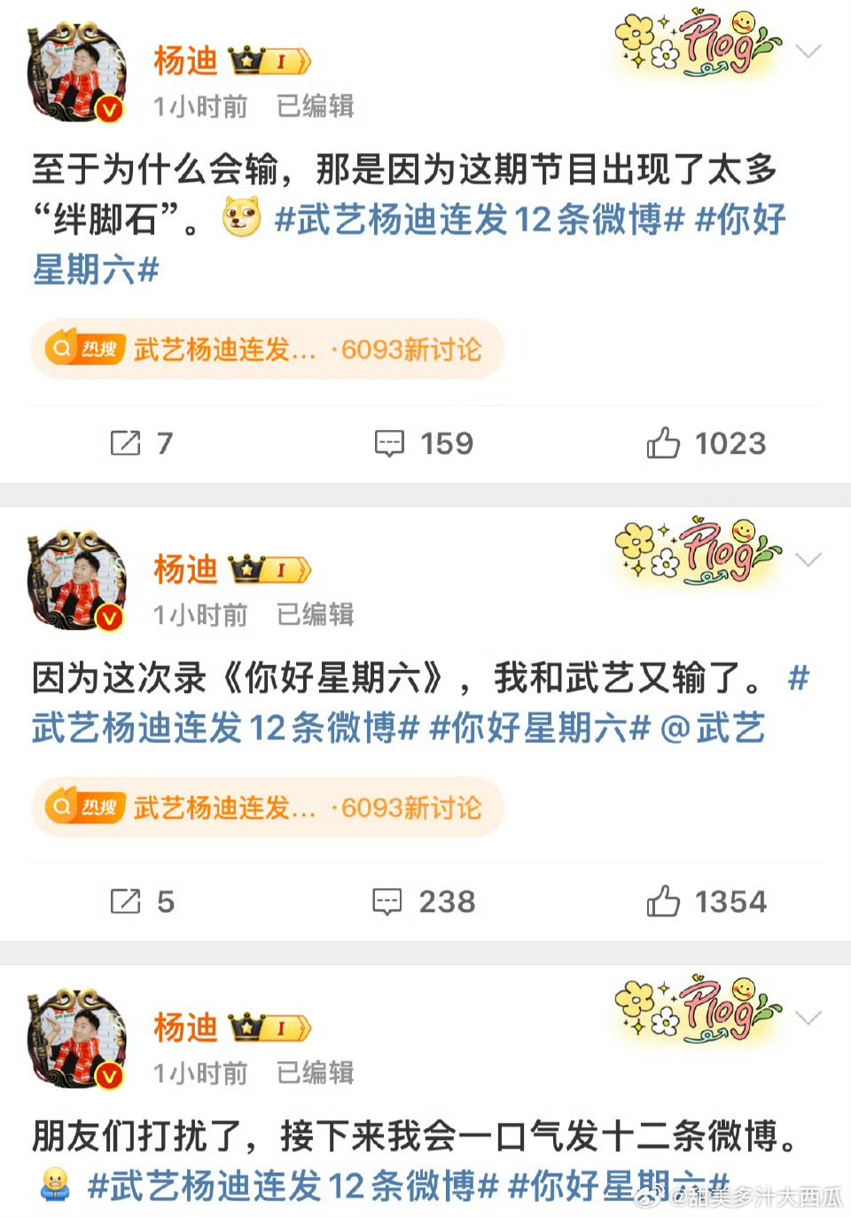 武艺杨迪连发12条微博你好星期六笑不活了,武艺杨迪游戏输了用12条微博“吐槽”,