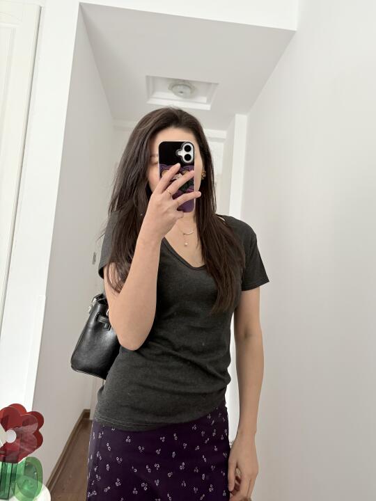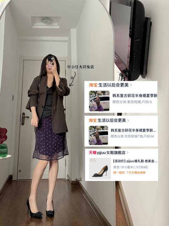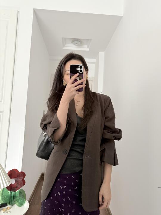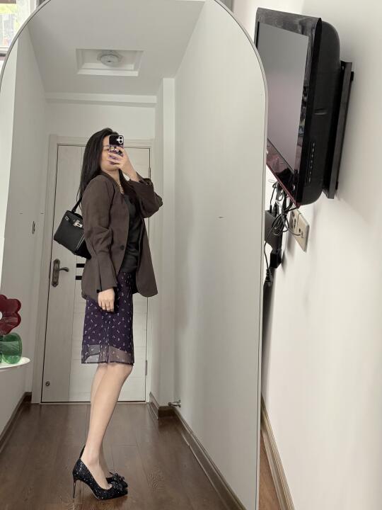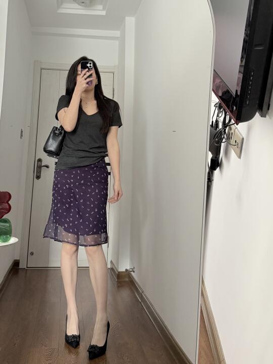 简简单单的早八通勤look,是5分钟就可以出门的舒适穿搭~ 灰色圆领T恤衫 紫色碎花短裙 咖色棉麻西装,薄款的,夏天穿也不会热的那种,袖口是喇叭袖的设计。 有些宝子会问我👙是穿的什么,多半时候我都会选无痕👙,今天穿的在P7-9, 玉肤纤维面料,舒适透气,裸感体验 无钢圈设计的舒适度很好。 如果穿紧身的衣服就会选择有钢圈的,下次穿了再分享。 👠是婚鞋来的,不灵不灵的我很喜欢~也有很多颜色可以选择,黑色则比较日常~ 良心分享,live图实出,所见即所得‼️