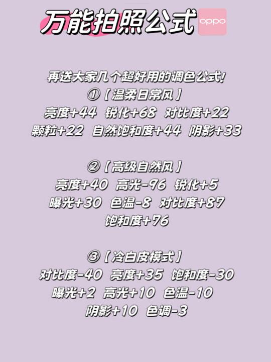 [蹲后续H][蹲后续H]使用oppo的宝子看过来! 本期给大家分享超好用的万能拍照📸公式! [彩虹R][彩虹R]快来学学!记得分享给你身边需要的宝儿~