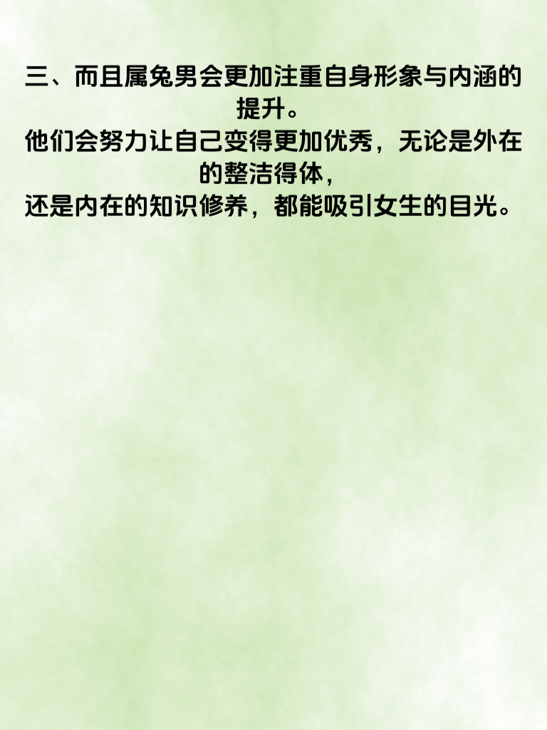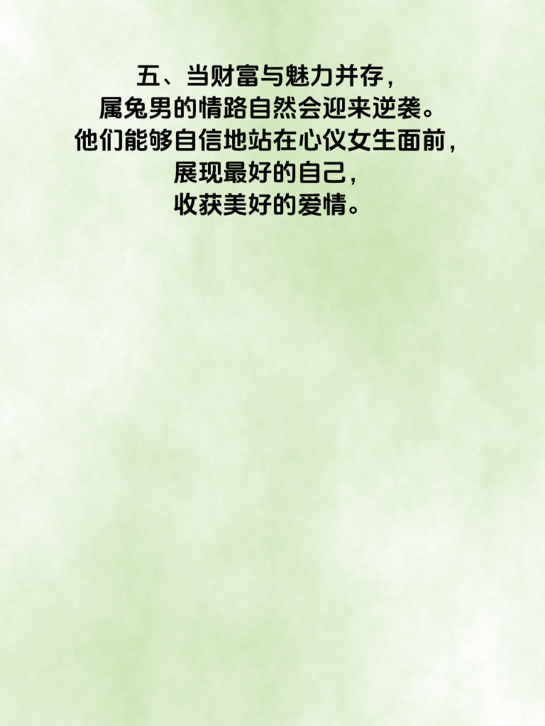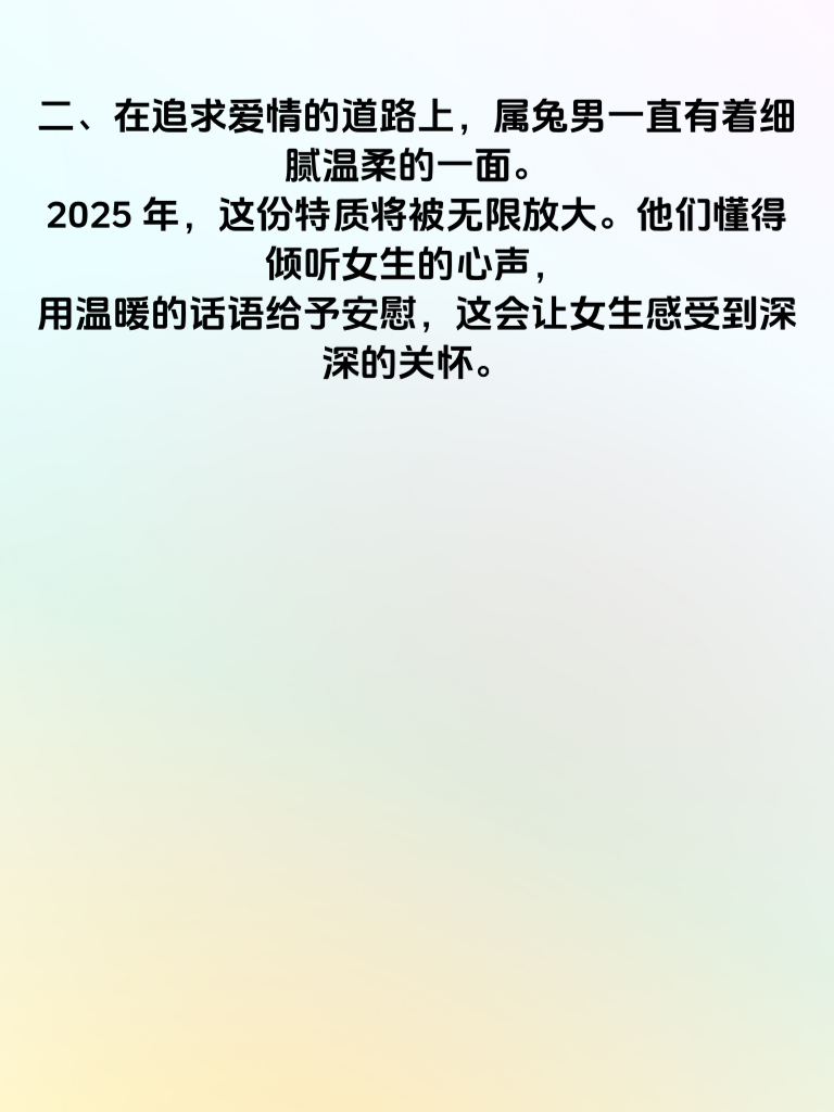 一、2025 年,对于属兔男来说,是充满惊喜的一年。情路逆袭,财富指数直线飙,仿佛命运的齿轮开始向着美好的方向转动。 二、在追求爱情的道路上,属兔男一直有着细腻温柔的一面。2025 年,这份特质将被无限放大。他们懂得倾听女生的心声,用温暖的话语给予安慰,这会让女生感受到深深的关怀。 三、而且属兔男会更加注重自身形象与内涵的提升。他们会努力让自己变得更加优秀,无论是外在的整洁得体,还是内在的知识修养,都能吸引女生的目光。 四、财富方面,属兔男在 2025 年也有不错的机遇。他们善于把握时机,凭借自身的智慧和努力,能收获更多的财富。而这份财富不仅能提升生活品质,在追求爱情时也更有底气。 五、当财富与魅力并存,属兔男的情路自然会迎来逆袭。他们能够自信地站在心仪女生面前,展现最好的自己,收获美好的爱情。