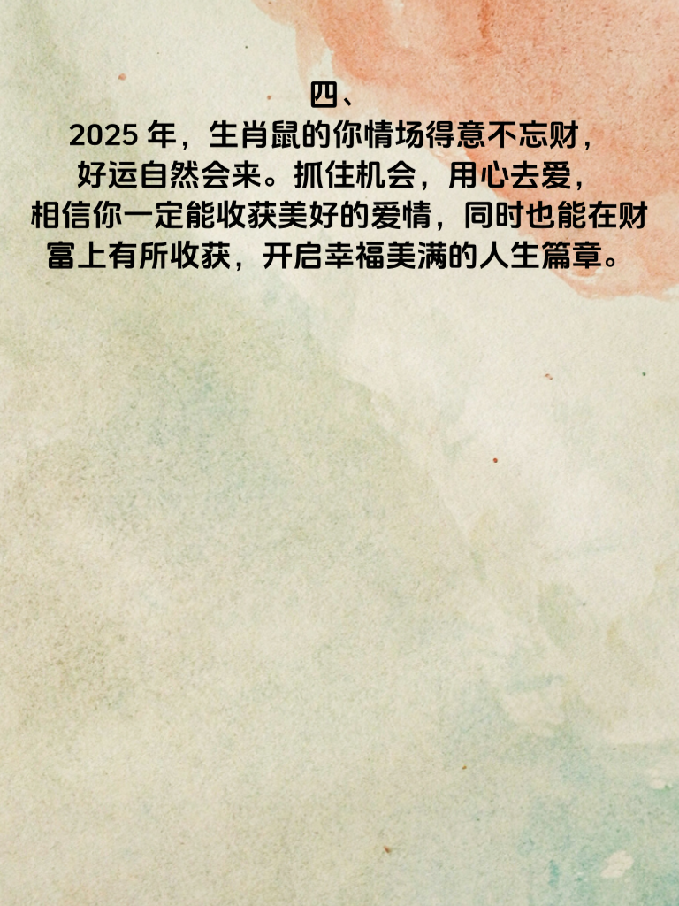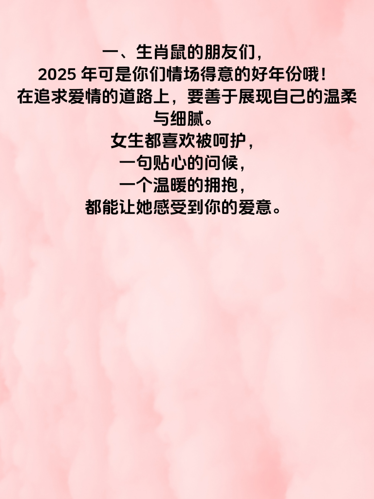 一、生肖鼠的朋友们,2025年可是你们情场得意的好年份哦!在追求爱情的道路上,要善于展现自己的温柔与细腻。女生都喜欢被呵护,一句贴心的问候,一个温暖的拥抱,都能让她感受到你的爱意。 二、同时,千万别忘了财气哦!努力工作,提升自己的经济实力,这不仅能让你更有自信,也能为你们的未来打下坚实的基础。当你有能力为她提供更好的生活时,她会更愿意与你携手相伴。 三、在与女生相处时,要学会倾听她的想法和感受。尊重她的意见,让她知道她在你心中是重要的。偶尔给她准备一些小惊喜,比如一束鲜花,一份她喜欢的小礼物,能让感情升温不少。 四、2025年,生肖鼠的你情场得意不忘财,好运自然会来。抓住机会,用心去爱,相信你一定能收获美好的爱情,同时也能在财富上有所收获,开启幸福美满的人生篇章。