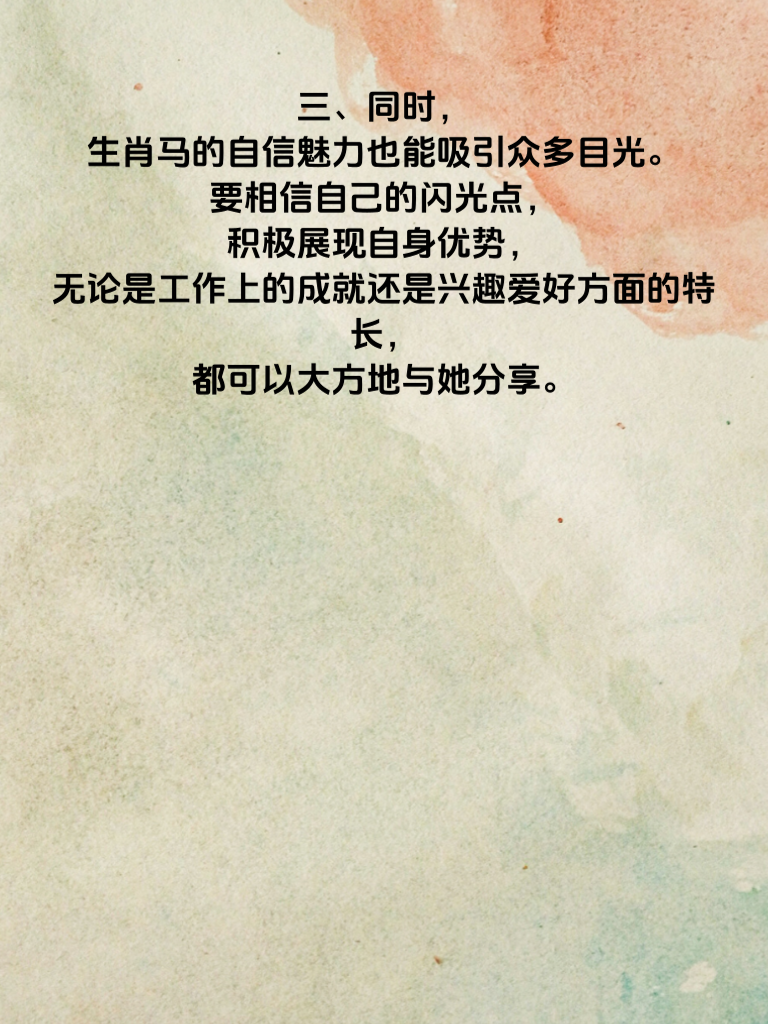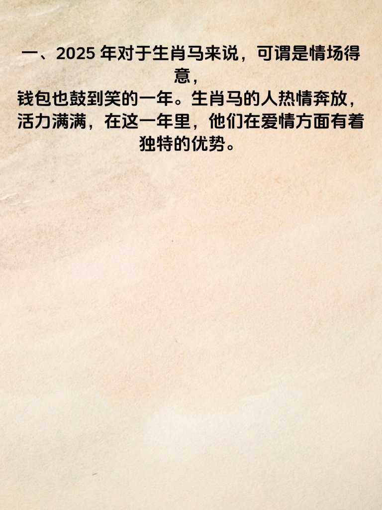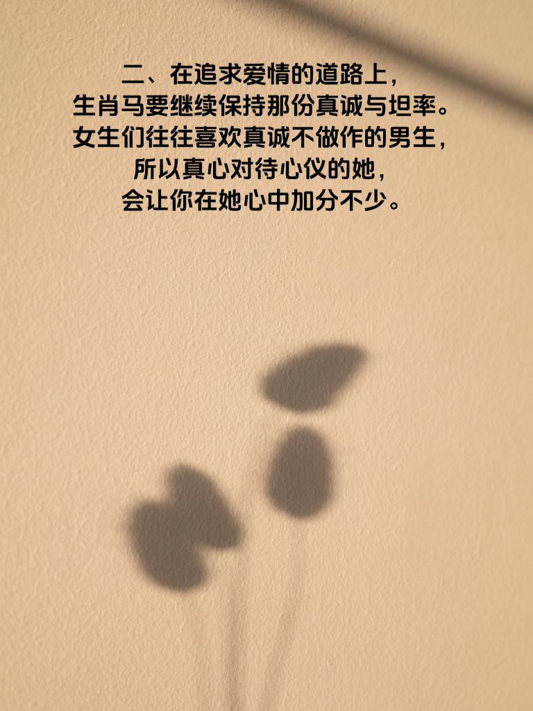 一、2025 年对于生肖马来说,可谓是情场得意,钱包也鼓到笑的一年。生肖马的人热情奔放,活力满满,在这一年里,他们在爱情方面有着独特的优势。 二、在追求爱情的道路上,生肖马要继续保持那份真诚与坦率。女生们往往喜欢真诚不做作的男生,所以真心对待心仪的她,会让你在她心中加分不少。 三、同时,生肖马的自信魅力也能吸引众多目光。要相信自己的闪光点,积极展现自身优势,无论是工作上的成就还是兴趣爱好方面的特长,都可以大方地与她分享。 四、而钱包鼓到笑,意味着经济上的稳定。这不仅能让自己生活更有底气,在追求女生时也更有优势。可以偶尔为她准备一些小惊喜,精心挑选礼物,带她去享受美好的约会,这些物质上的付出能增添不少浪漫氛围。 五、但要记住,物质只是一部分,精神上的契合才是关键。用心去了解她的喜好和梦想,与她一起规划未来,让她感受到你满满的爱意与诚意。如此,生肖马在 2025 年定能在情场收获甜蜜爱情,钱包也因爱情的滋润而更加充实。
