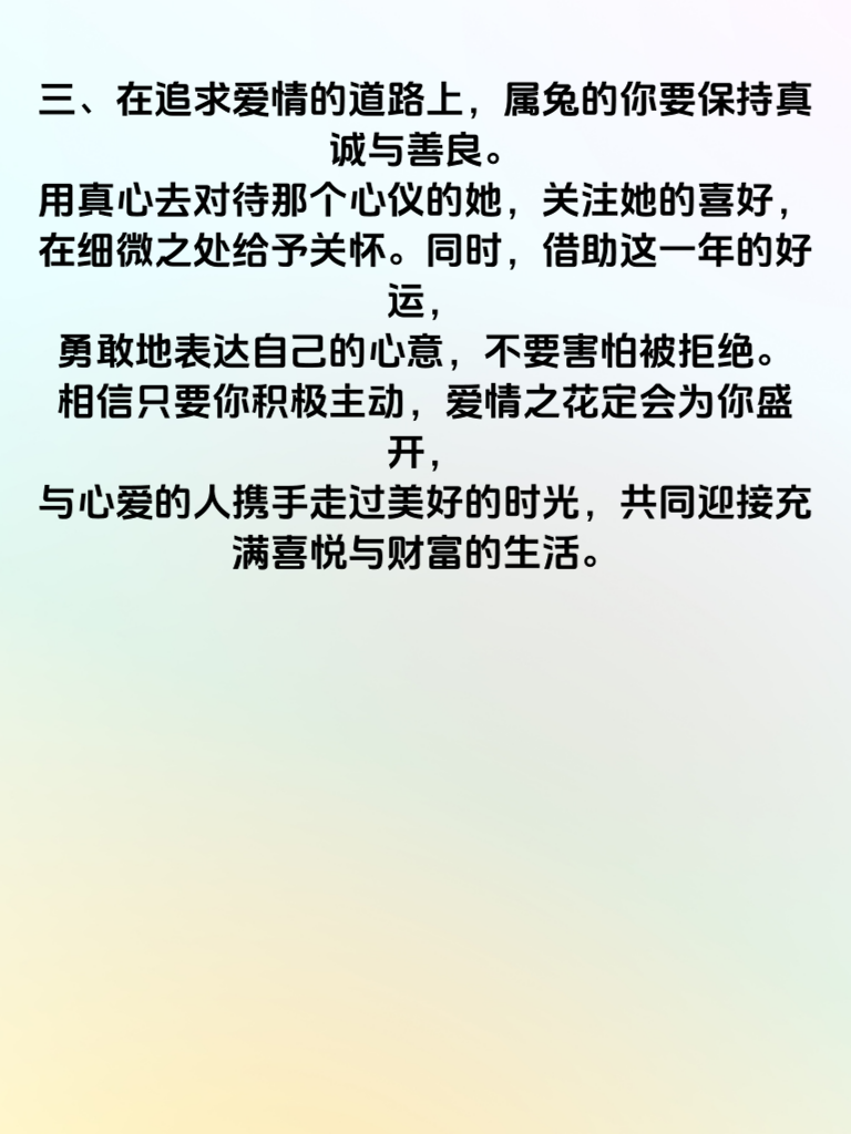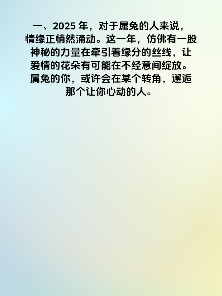 一、2025 年,对于属兔的人来说,情缘正悄然涌动。这一年,仿佛有一股神秘的力量在牵引着缘分的丝线,让爱情的花朵有可能在不经意间绽放。属兔的你,或许会在某个转角,邂逅那个让你心动的人。 二、而更值得欣喜的是,财星入命,为你的生活带来喜洋洋的氛围。在情感世界里,经济基础也有着重要的作用。稳定的财务状况能让你更自信地去追求爱情,为你们的未来打下坚实的物质基础。 三、在追求爱情的道路上,属兔的你要保持真诚与善良。用真心去对待那个心仪的她,关注她的喜好,在细微之处给予关怀。同时,借助这一年的好运,勇敢地表达自己的心意,不要害怕被拒绝。相信只要你积极主动,爱情之花定会为你盛开,与心爱的人携手走过美好的时光,共同迎接充满喜悦与财富的生活。
