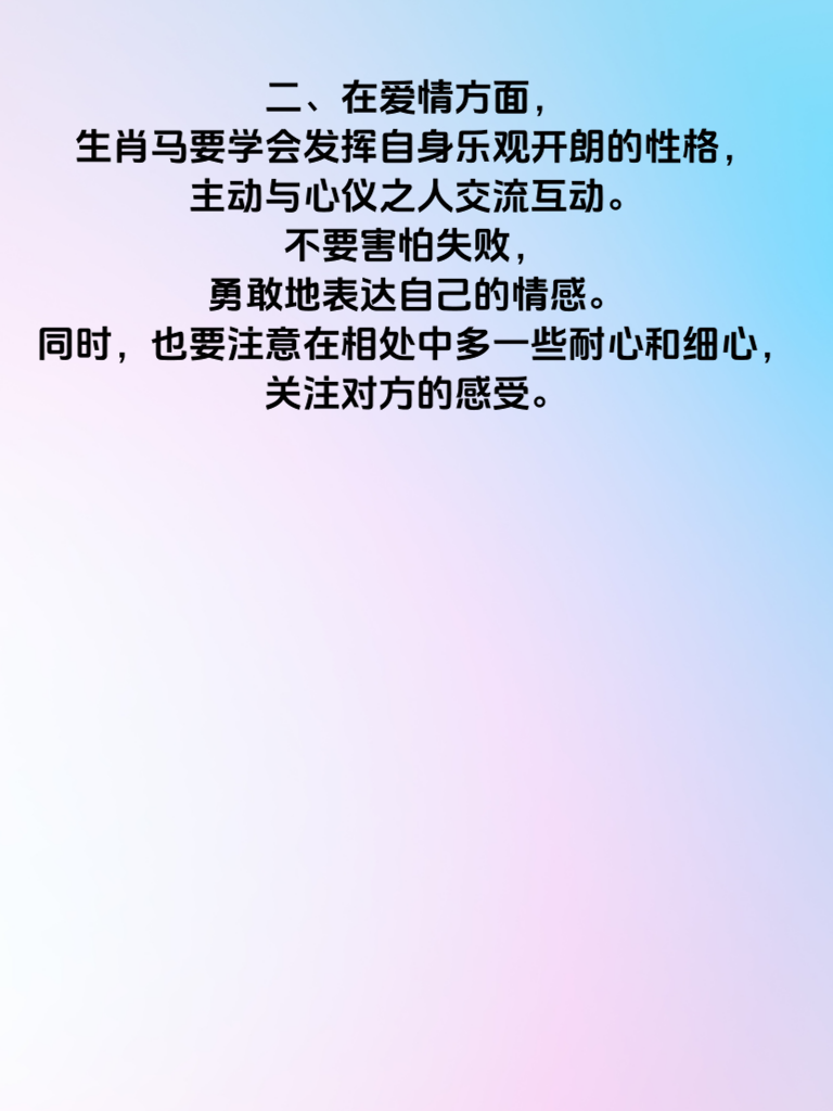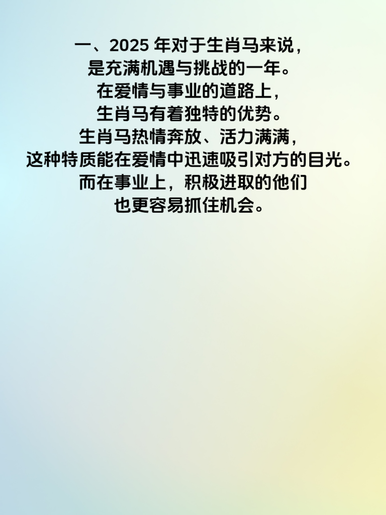 一、2025年对于生肖马来说,是充满机遇与挑战的一年。在爱情与事业的道路上,生肖马有着独特的优势。生肖马热情奔放、活力满满,这种特质能在爱情中迅速吸引对方的目光。而在事业上,积极进取的他们也更容易抓住机会。 二、在爱情方面,生肖马要学会发挥自身乐观开朗的性格,主动与心仪之人交流互动。不要害怕失败,勇敢地表达自己的情感。同时,也要注意在相处中多一些耐心和细心,关注对方的感受。 三、事业上,生肖马凭借着勇往直前的冲劲,更容易在竞争中脱颖而出。要善于利用自己的人脉资源,拓展事业版图。遇到困难时,保持坚定的信念,相信自己能够马到功成。只要生肖马能巧妙借势,定能在2025年实现爱情与事业的双赢。